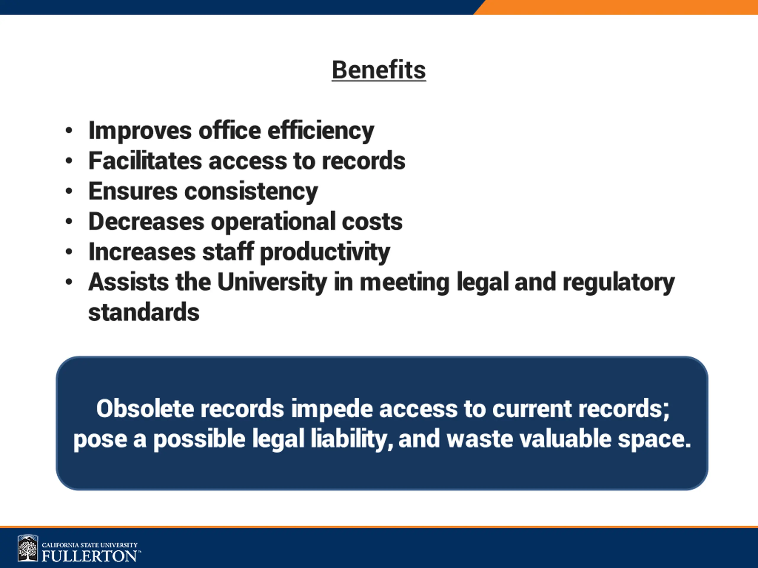 Benefits Improves office efficiency Facilitates access to records Ensures consistency Decreases operational costs Increases staff productivity Assists the University in meeting legal and regulatory standards Obsolete records impede access to current records; pose a possible legal liability, and waste valuable space.