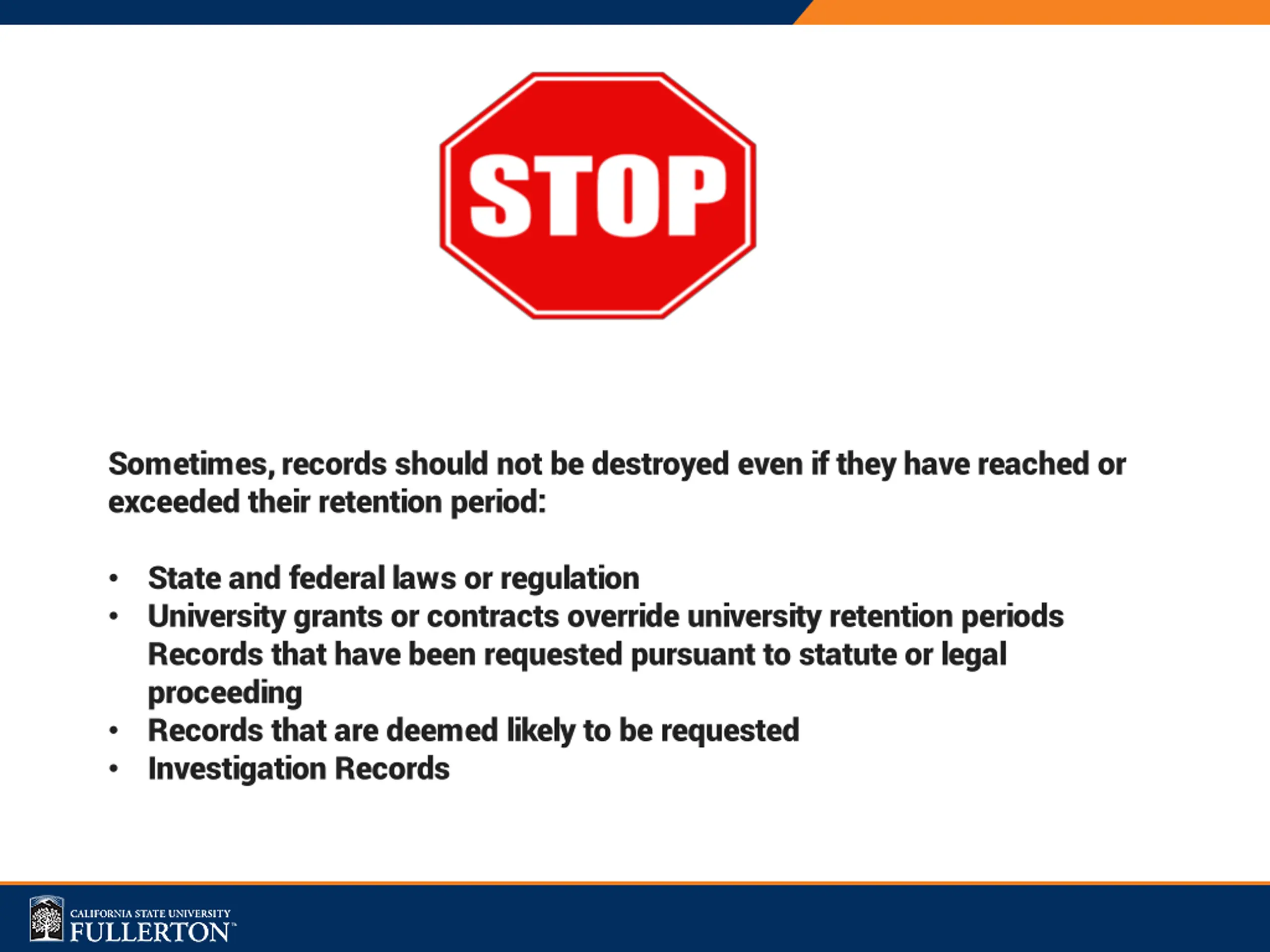 Sometimes, records should not be destroyed even if they have reached or exceeded their retention period: State and federal laws or regulation University grants or contracts override university retention periods Records that have been requested pursuant to statute or legal proceeding Records that are deemed likely to be requested Investigation Records