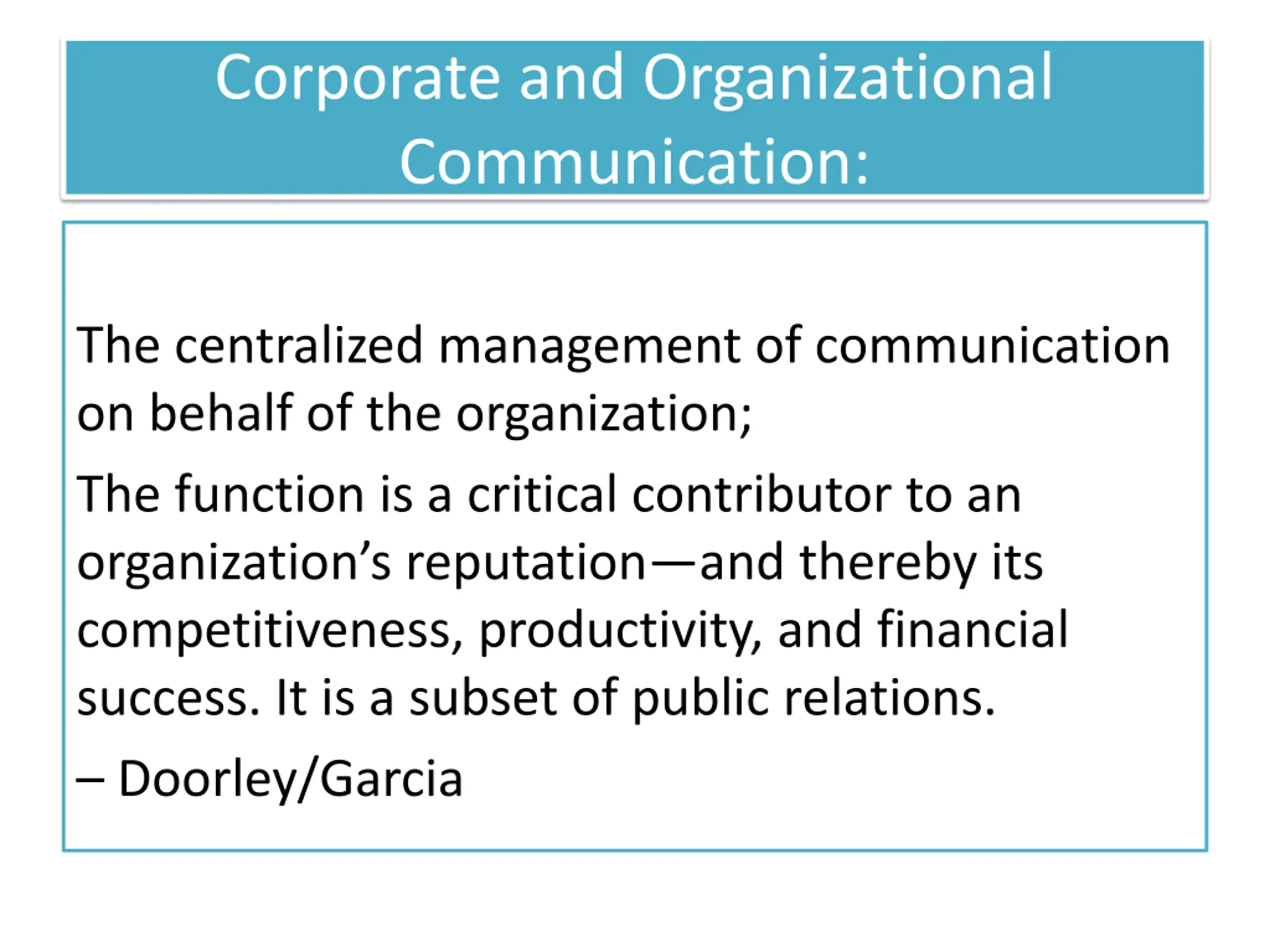 Corporate and Organizational Communication: The centralized management of communication on behalf of the organization; The function is a critical contributor to an organization s reputation and thereby its competitiveness, productivity, and financial success. It is a subset of public relations. Doorley/Garcia