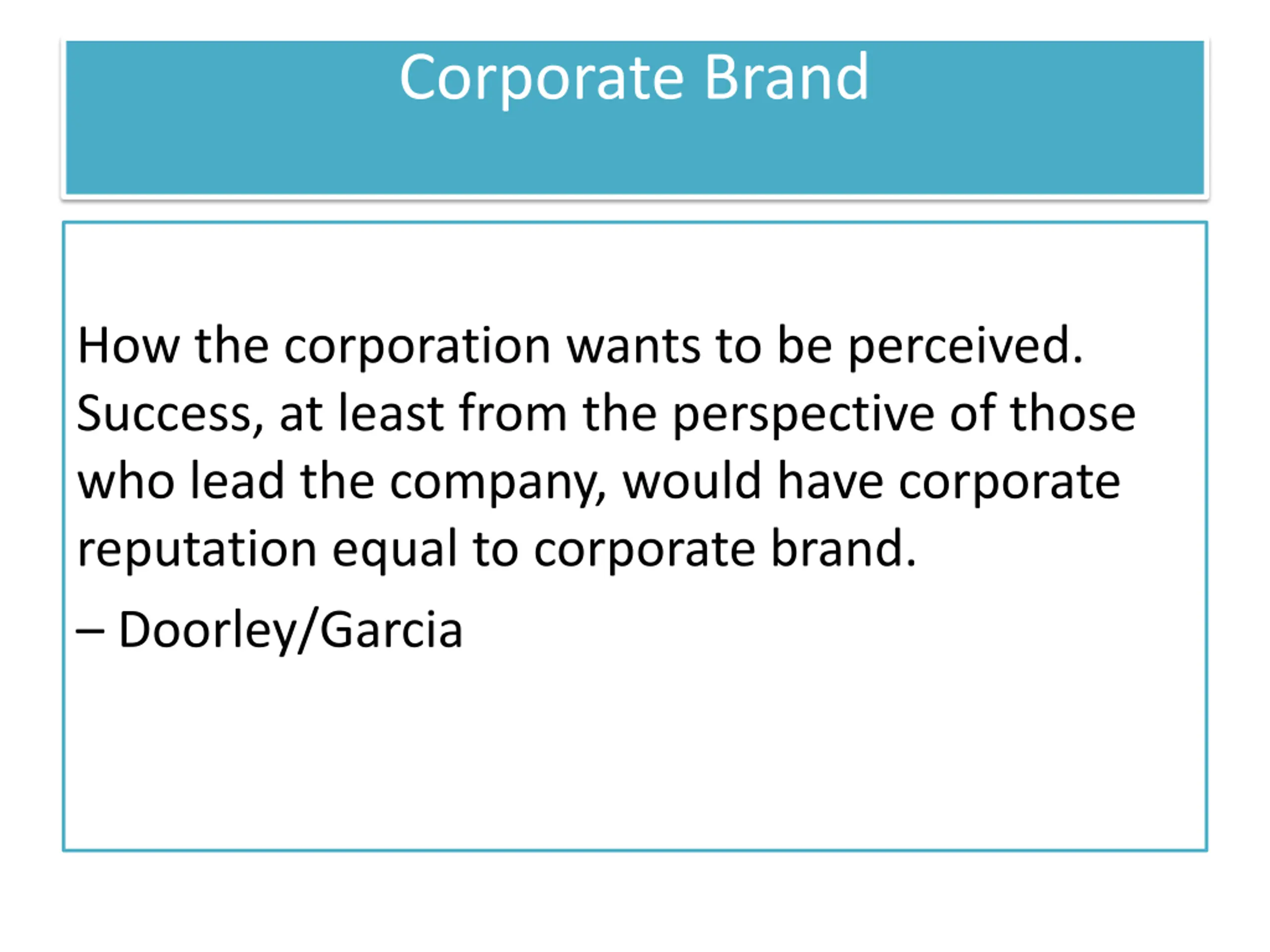 Corporate Brand How the corporation wants to be perceived. Success, at least from the perspective of those who lead the company, would have corporate reputation equal to corporate brand. Doorley/Garcia