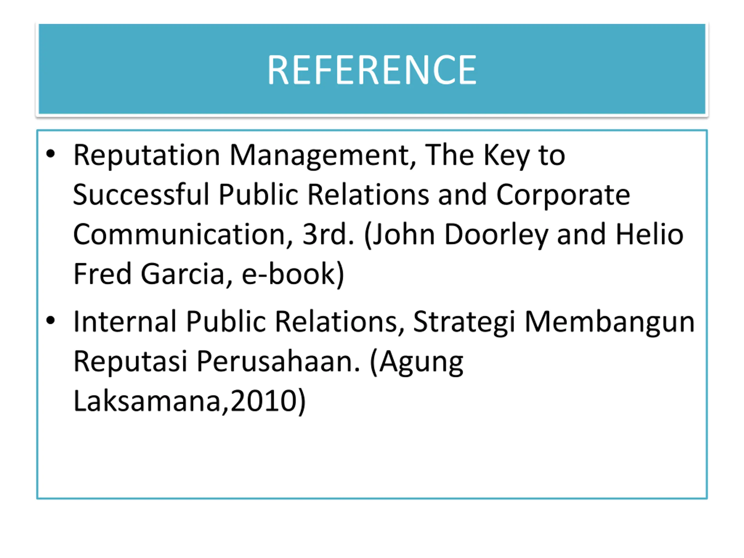 REFERENCE Reputation Management, The Key to Successful Public Relations and Corporate Communication, 3rd. (John Doorley and Helio Fred Garcia, e-book) Internal Public Relations, Strategi Membangun Reputasi Perusahaan. (Agung Laksamana,2010)