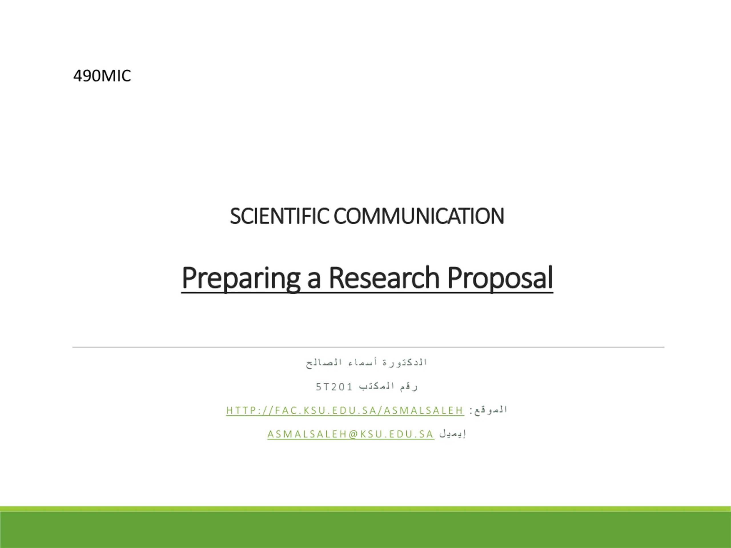 490MIC SCIENTIFIC COMMUNICATION SCIENTIFIC COMMUNICATION Preparing a Research Proposal Preparing a Research Proposal 5T201 : HTTP://FAC.KSU.EDU.SA/ASMALSALEH ASMALSALEH@KSU.EDU.SA