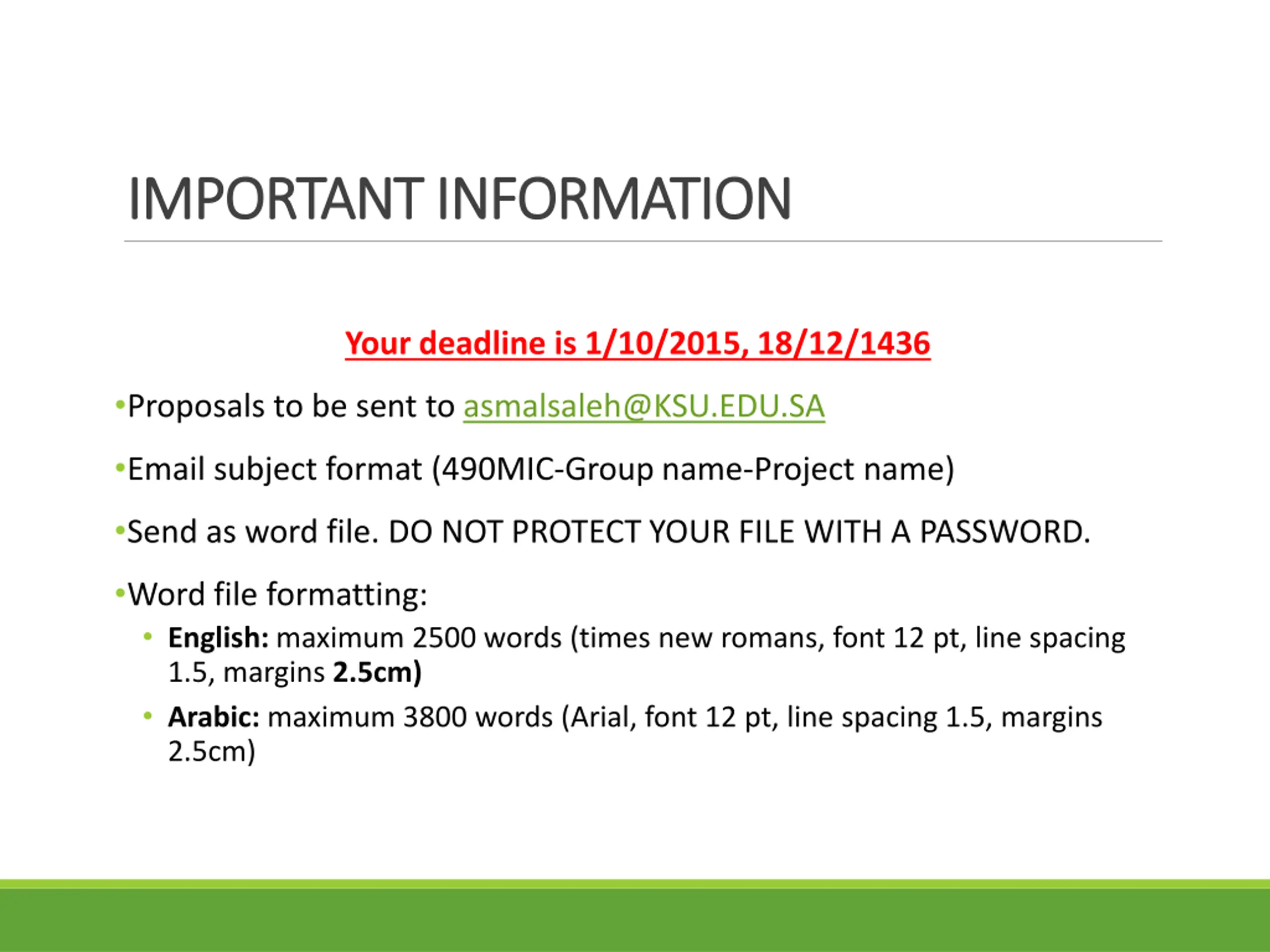 IMPORTANT INFORMATION IMPORTANT INFORMATION Your deadline is 1/10/2015, 18/12/1436 Proposals to be sent to asmalsaleh@KSU.EDU.SA Email subject format (490MIC-Group name-Project name) Send as word file. DO NOT PROTECT YOUR FILE WITH A PASSWORD. Word file formatting: English: maximum 2500 words (times new romans, font 12 pt, line spacing 1.5, margins 2.5cm) Arabic: maximum3800 words (Arial, font 12 pt, line spacing 1.5, margins 2.5cm)