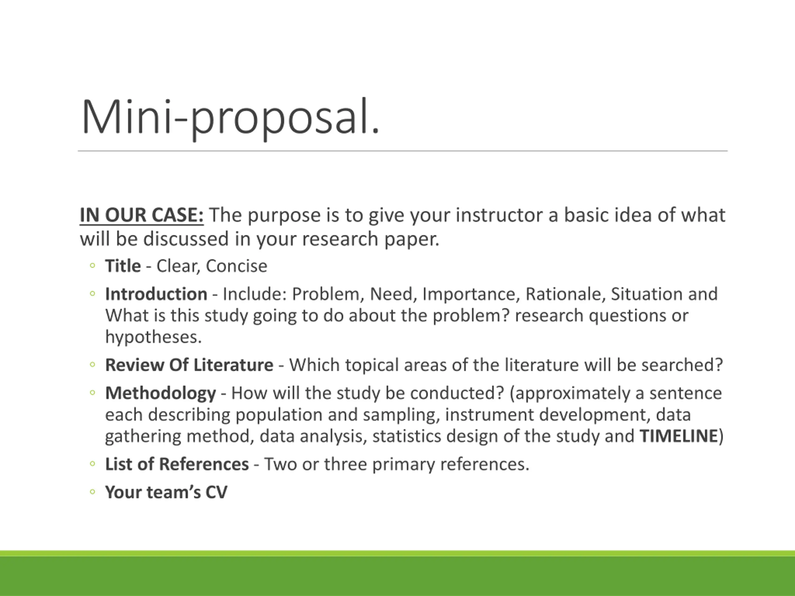 Mini-proposal. IN OUR CASE: The purpose is to give your instructor a basic idea of what will be discussed in your research paper. Title - Clear, Concise Introduction - Include: Problem, Need, Importance, Rationale, Situation and What is this study going to do about the problem? research questions or hypotheses. Review Of Literature - Which topical areas of the literature will be searched? Methodology - How will the study be conducted? (approximately a sentence each describing population and sampling, instrument development, data gathering method, data analysis, statistics design of the study and TIMELINE) List of References - Two or three primary references. Your team s CV