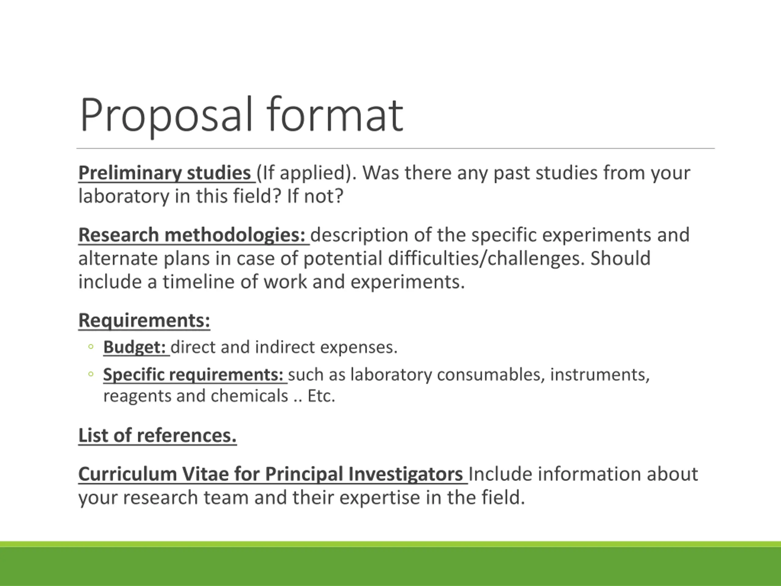 Proposal format Preliminary studies (If applied). Was there any past studies from your laboratory in this field? If not? Research methodologies: description of the specific experiments and alternate plans in case of potential difficulties/challenges. Should include a timeline of work and experiments. Requirements: Budget: direct and indirect expenses. Specific requirements: such as laboratory consumables, instruments, reagents and chemicals .. Etc. List of references. Curriculum Vitae for Principal Investigators Include information about your research team and their expertise in the field.