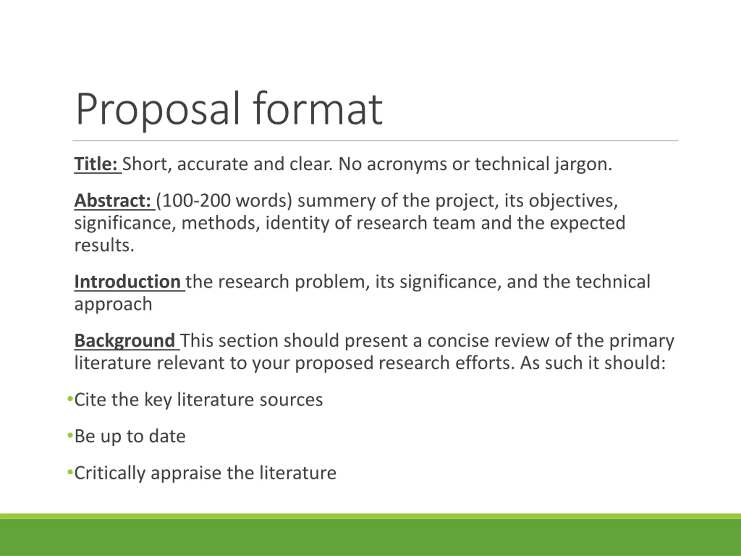 Proposal format Title: Short, accurate and clear. No acronyms or technical jargon. Abstract: (100-200 words) summery of the project, its objectives, significance, methods, identity of research team and the expected results. Introduction the research problem, its significance, and the technical approach Background This section should present a concise review of the primary literature relevant to your proposed research efforts. As such it should: Cite the key literature sources Be up to date Critically appraise the literature