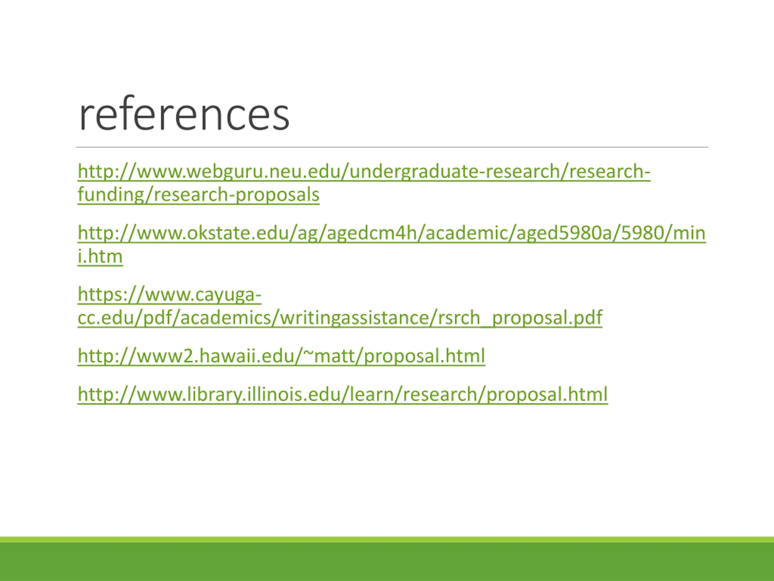 references http://www.webguru.neu.edu/undergraduate-research/research- funding/research-proposals http://www.okstate.edu/ag/agedcm4h/academic/aged5980a/5980/min i.htm https://www.cayuga- cc.edu/pdf/academics/writingassistance/rsrch_proposal.pdf http://www2.hawaii.edu/~matt/proposal.html http://www.library.illinois.edu/learn/research/proposal.html