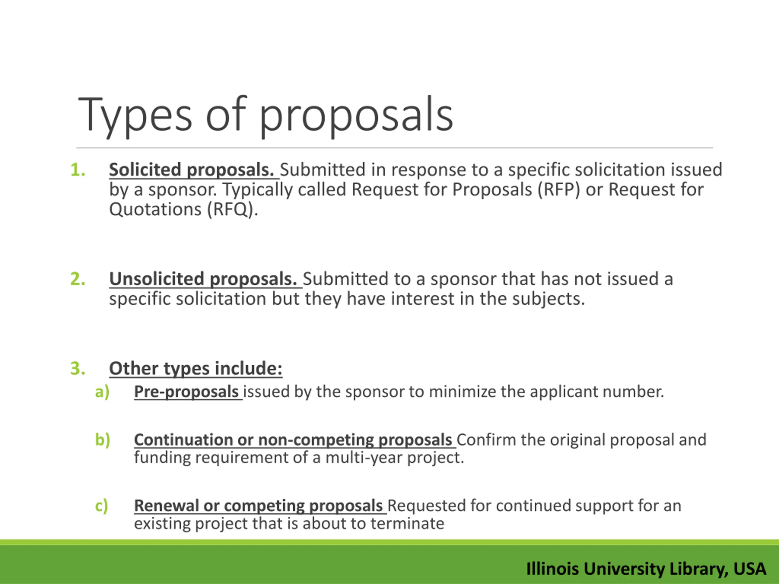 Types of proposals 1. Solicited proposals. Submitted in response to a specific solicitation issued by a sponsor. Typically called Request for Proposals (RFP) or Request for Quotations (RFQ). 2. Unsolicited proposals. Submitted to a sponsor that has not issued a specific solicitation but they have interest in the subjects. 3. Other types include: a) Pre-proposals issued by the sponsor to minimize the applicant number. b) Continuation or non-competing proposals Confirm the original proposal and funding requirement of a multi-year project. c) Renewal or competing proposals Requested for continued support for an existing project that is about to terminate Illinois University Library, USA