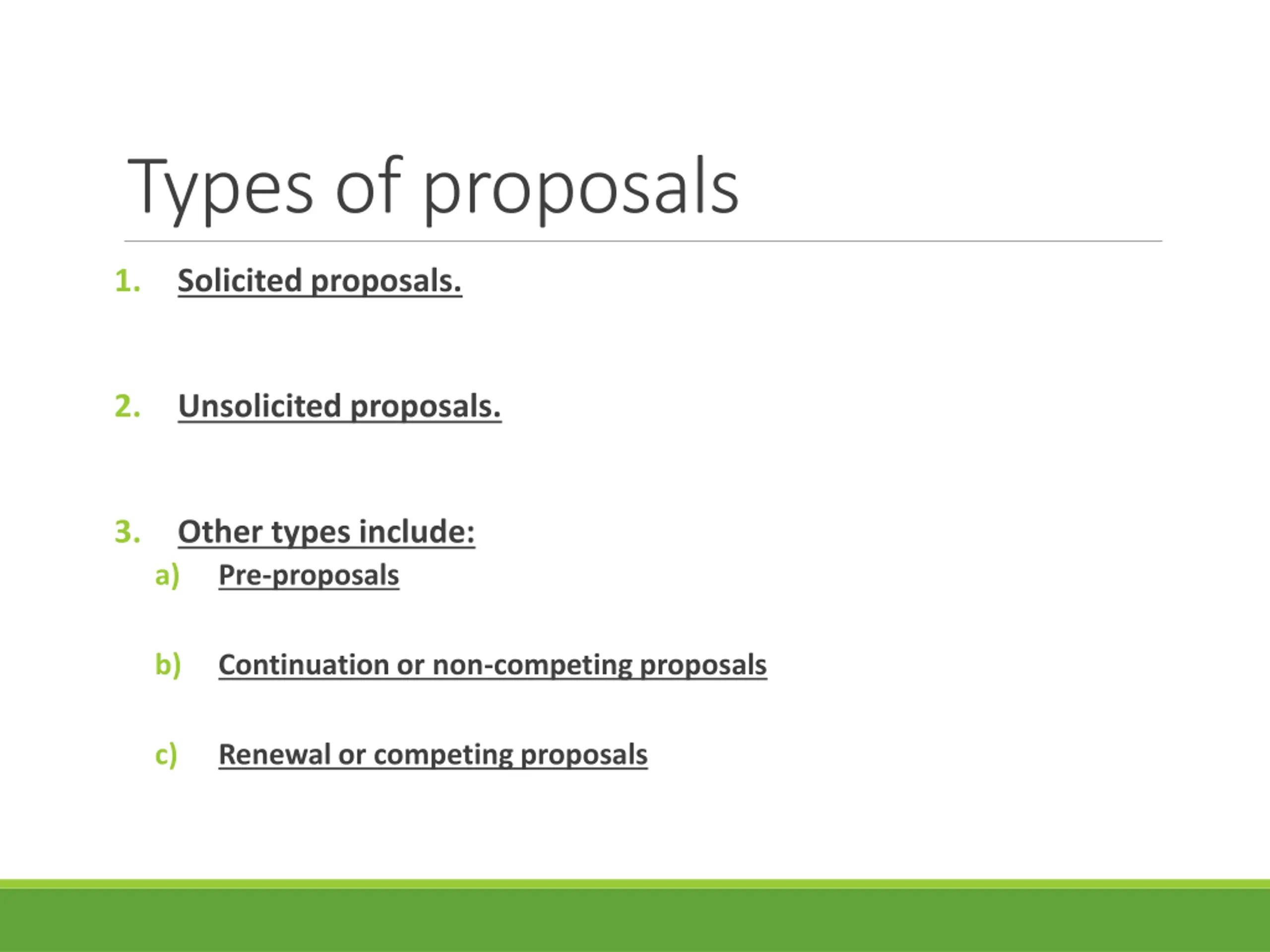 Types of proposals 1. Solicited proposals. 2. Unsolicited proposals. 3. Other types include: a) Pre-proposals b) Continuation or non-competing proposals c) Renewal or competing proposals