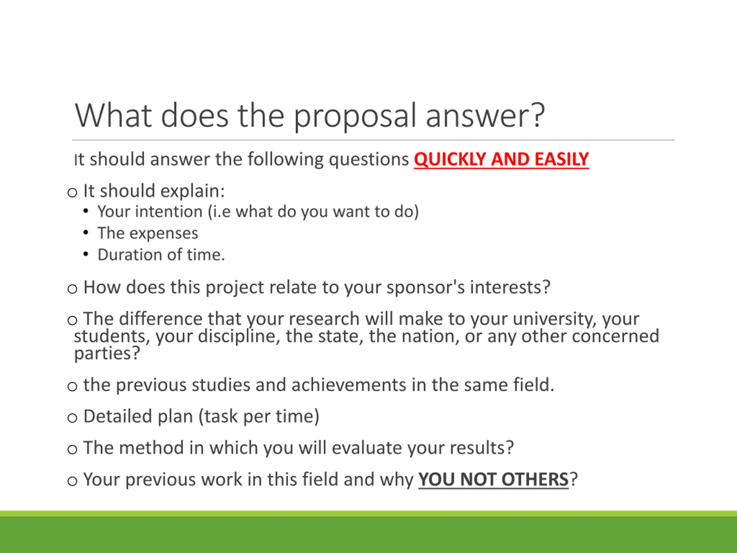 What does the proposal answer? It should answer the following questions QUICKLY AND EASILY o It should explain: Your intention (i.e what do you want to do) The expenses Duration of time. o How does this project relate to your sponsor's interests? o The difference that your research will make to your university, your students, your discipline, the state, the nation, or any other concerned parties? o the previous studies and achievements in the same field. o Detailed plan (task per time) o The method in which you will evaluate your results? o Your previous work in this field and why YOU NOT OTHERS?