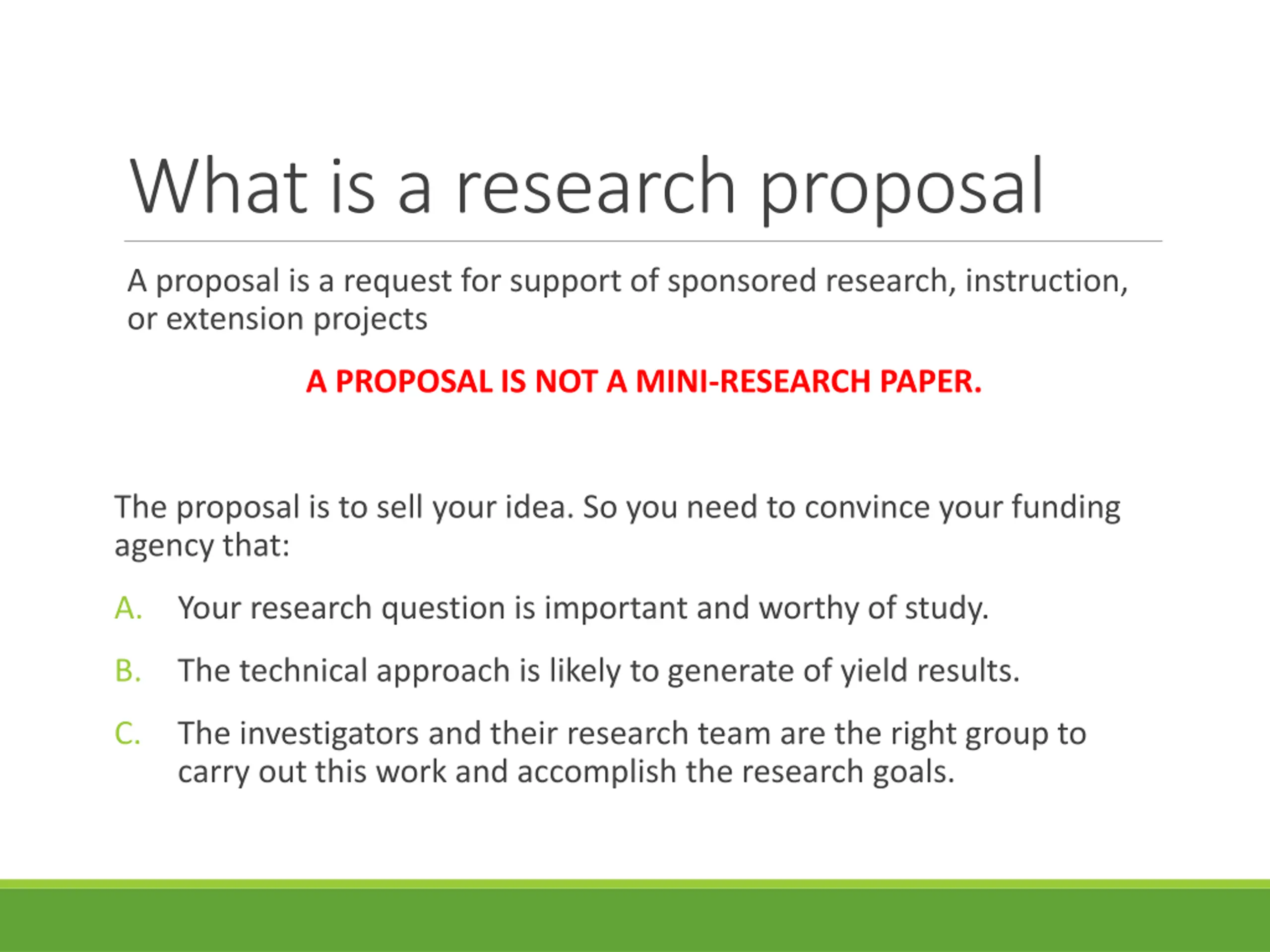 What is a research proposal A proposal is a request for support of sponsored research, instruction, or extension projects A PROPOSAL IS NOT A MINI-RESEARCH PAPER. The proposal is to sell your idea. So you need to convince your funding agency that: A. Your research question is important and worthy of study. B. The technical approach is likely to generate of yield results. C. The investigators and their research team are the right group to carry out this work and accomplish the research goals.
