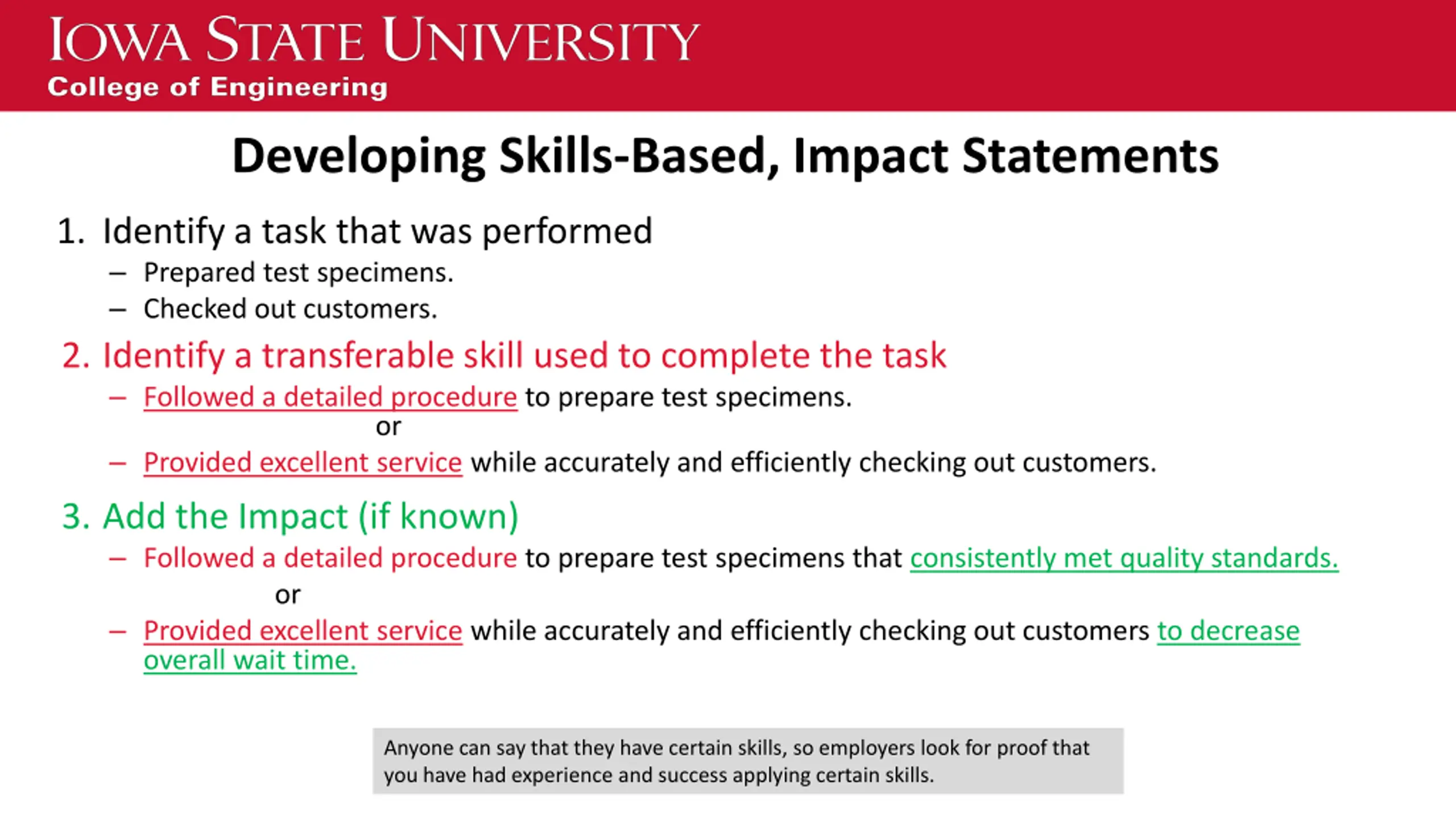 Developing Skills-Based, Impact Statements 1. Identify a task that was performed Prepared test specimens. Checked out customers. 2. Identify a transferable skill used to complete the task Followed a detailed procedure to prepare test specimens. or Provided excellent service while accurately and efficiently checking out customers. 3. Add the Impact (if known) Followed a detailed procedure to prepare test specimens that consistently met quality standards. or Provided excellent service while accurately and efficiently checking out customers to decrease overall wait time. Anyone can say that they have certain skills, so employers look for proof that you have had experience and success applying certain skills.