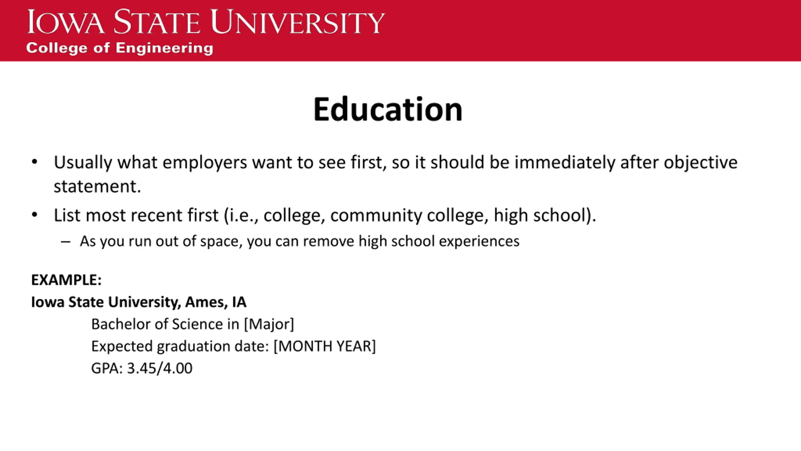 Education Usually what employers want to see first, so it should be immediately after objective statement. List most recent first (i.e., college, community college, high school). As you run out of space, you can remove high school experiences EXAMPLE: Iowa State University, Ames, IA Bachelor of Science in [Major] Expected graduation date: [MONTH YEAR] GPA: 3.45/4.00