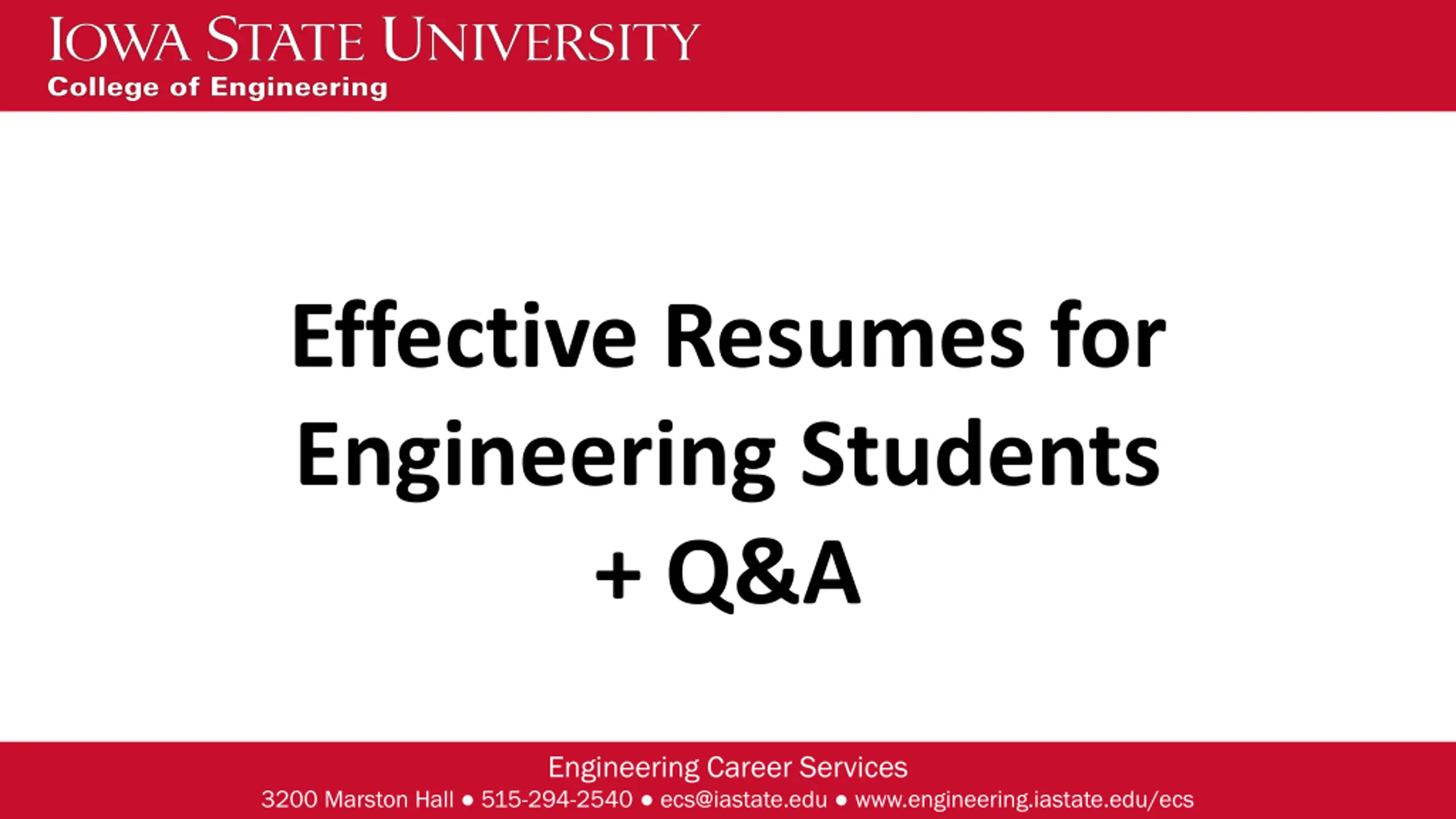 Effective Resumes for Engineering Students + Q&A Engineering Career Services 3200 Marston Hall 515-294-2540 ecs@iastate.edu www.engineering.iastate.edu/ecs