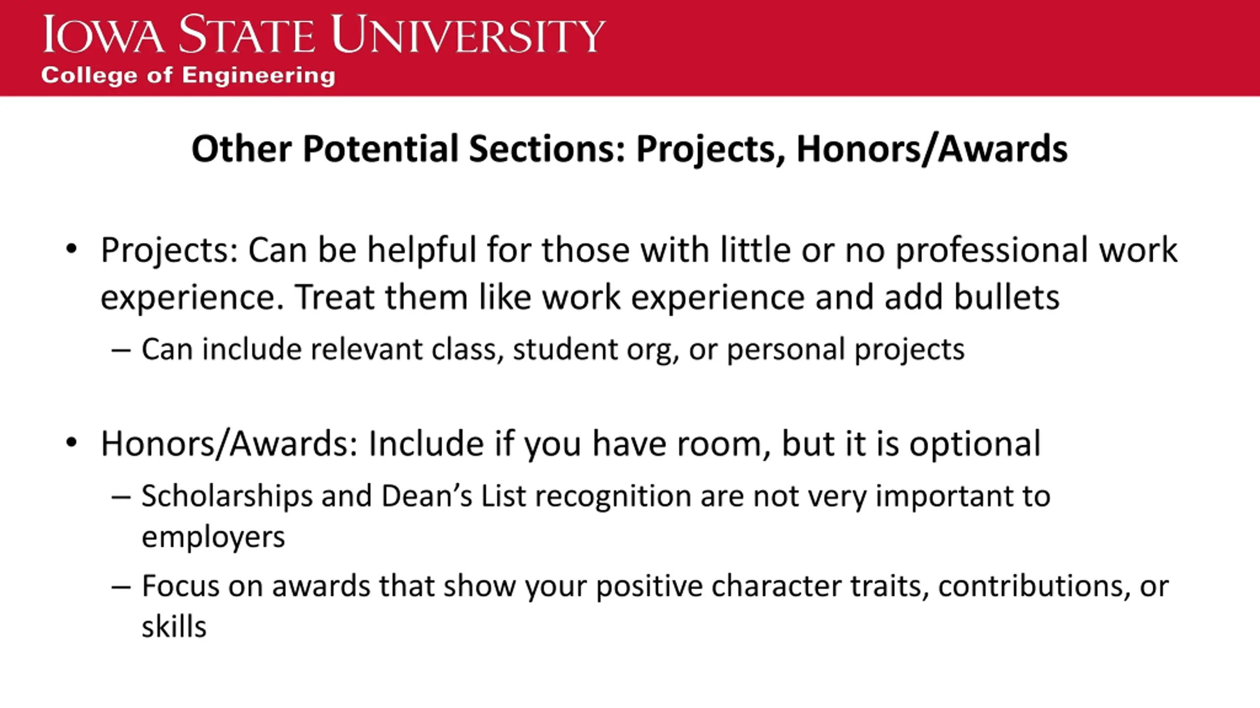 Other Potential Sections: Projects, Honors/Awards Projects: Can be helpful for those with little or no professional work experience. Treat them like work experience and add bullets Can include relevant class, student org, or personal projects Honors/Awards: Include if you have room, but it is optional Scholarships and Dean s List recognition are not very important to employers Focus on awards that show your positive character traits, contributions, or skills