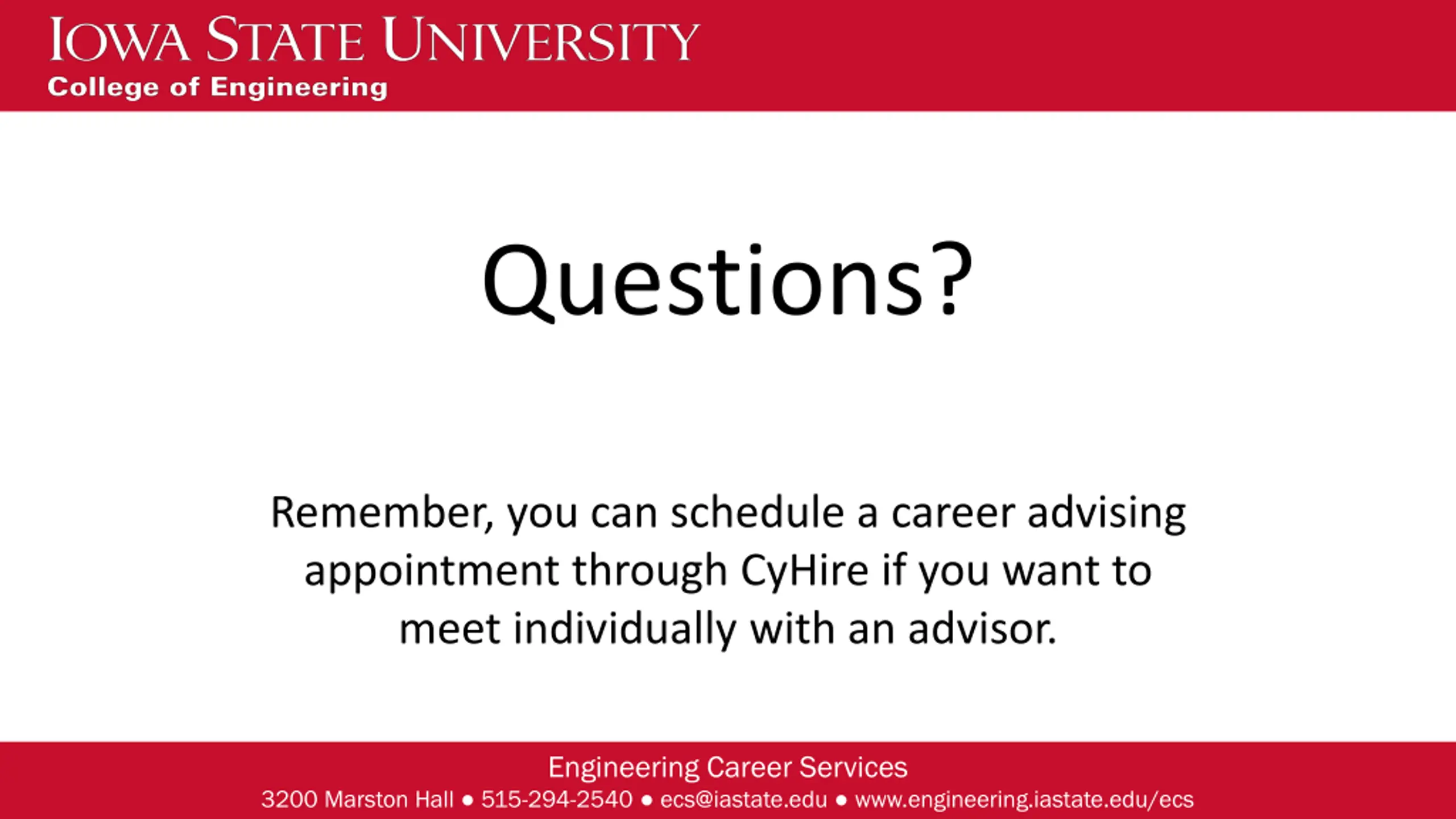 Questions? Remember, you can schedule a career advising appointment through CyHire if you want to meet individually with an advisor. Engineering Career Services 3200 Marston Hall 515-294-2540 ecs@iastate.edu www.engineering.iastate.edu/ecs
