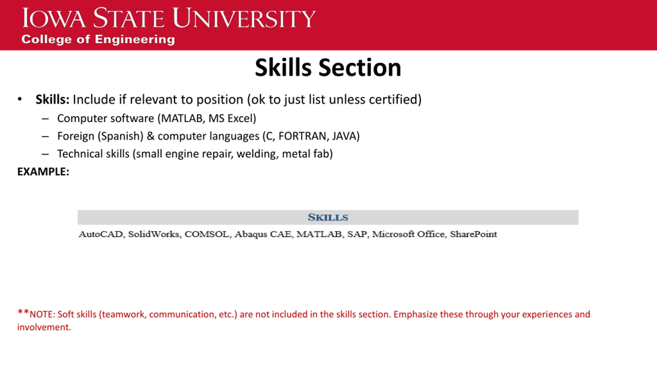 Skills Section Skills: Include if relevant to position (ok to just list unless certified) Computer software (MATLAB, MS Excel) Foreign (Spanish) & computer languages (C, FORTRAN, JAVA) Technical skills (small engine repair, welding, metal fab) EXAMPLE: **NOTE: Soft skills (teamwork, communication, etc.) are not included in the skills section. Emphasize these through your experiences and involvement.