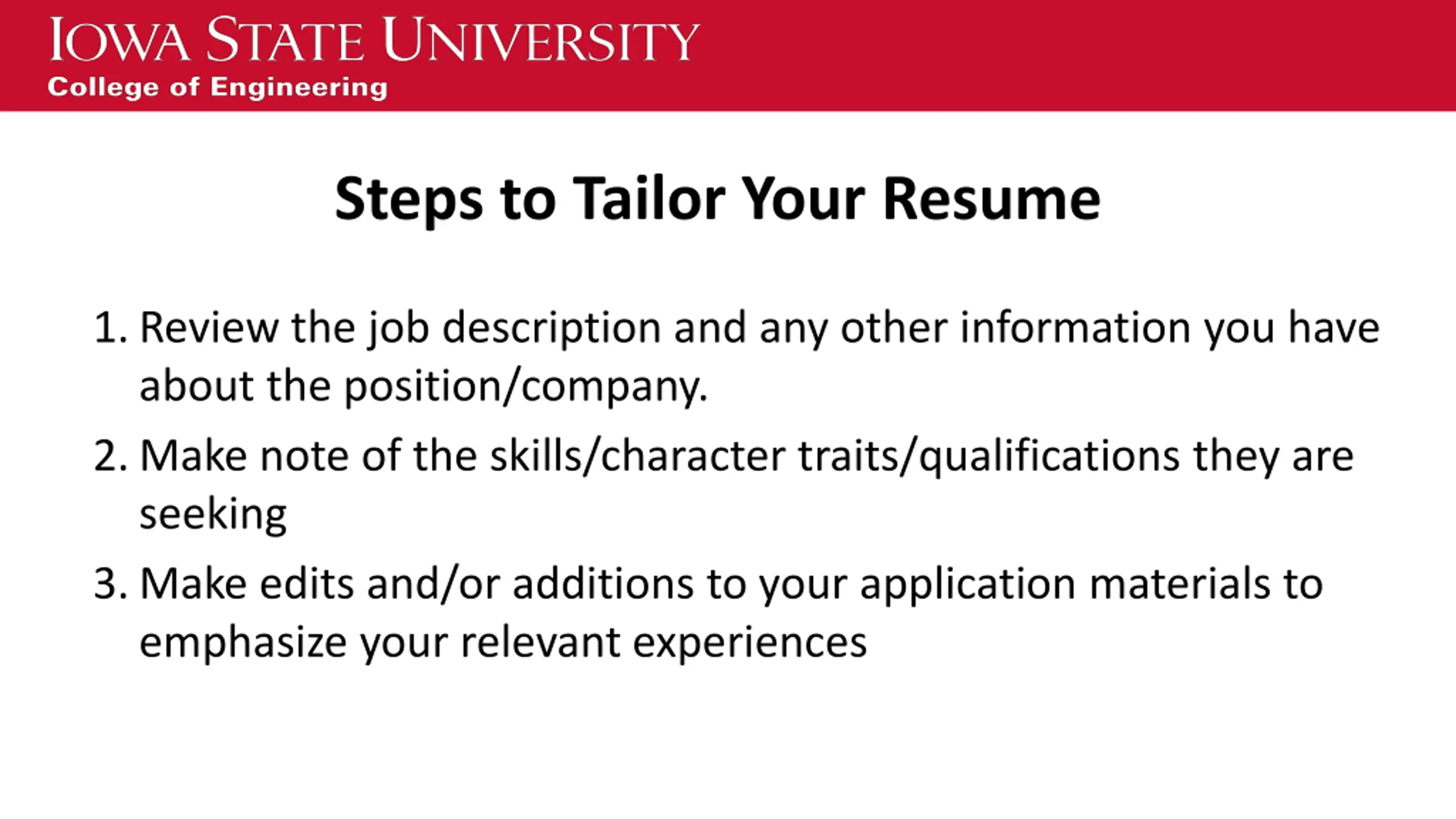 Steps to Tailor Your Resume 1.Review the job description and any other information you have about the position/company. 2.Make note of the skills/character traits/qualifications they are seeking 3.Make edits and/or additions to your application materials to emphasize your relevant experiences
