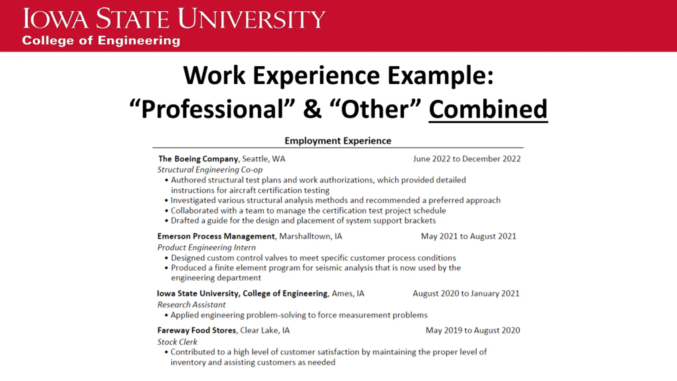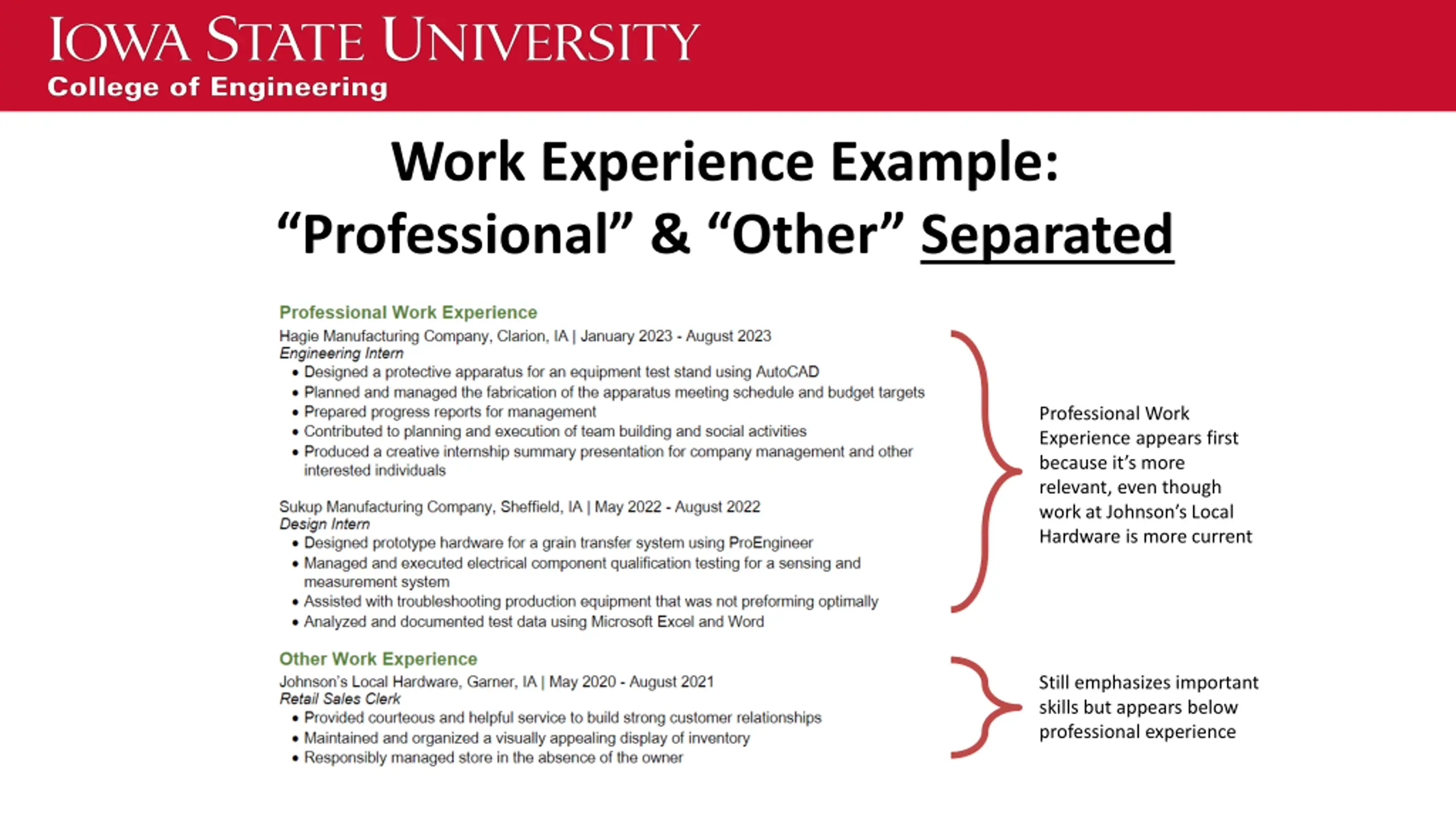 Work Experience Example: Professional & Other Separated Professional Work Experience appears first because it s more relevant, even though work at Johnson s Local Hardware is more current Still emphasizes important skills but appears below professional experience