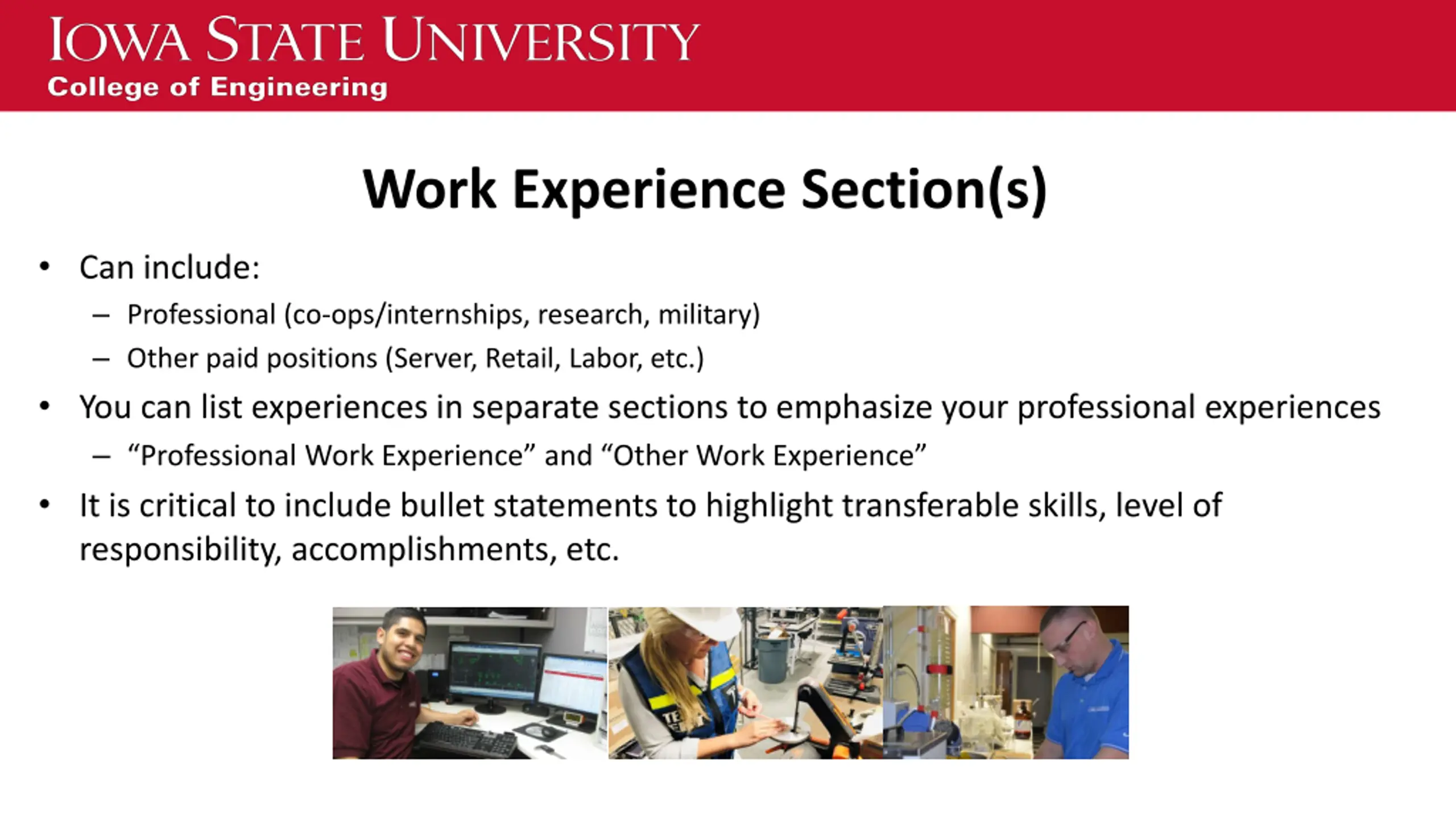 Work Experience Section(s) Can include: Professional (co-ops/internships, research, military) Other paid positions (Server, Retail, Labor, etc.) You can list experiences in separate sections to emphasize your professional experiences Professional Work Experience and Other Work Experience It is critical to include bullet statements to highlight transferable skills, level of responsibility, accomplishments, etc.