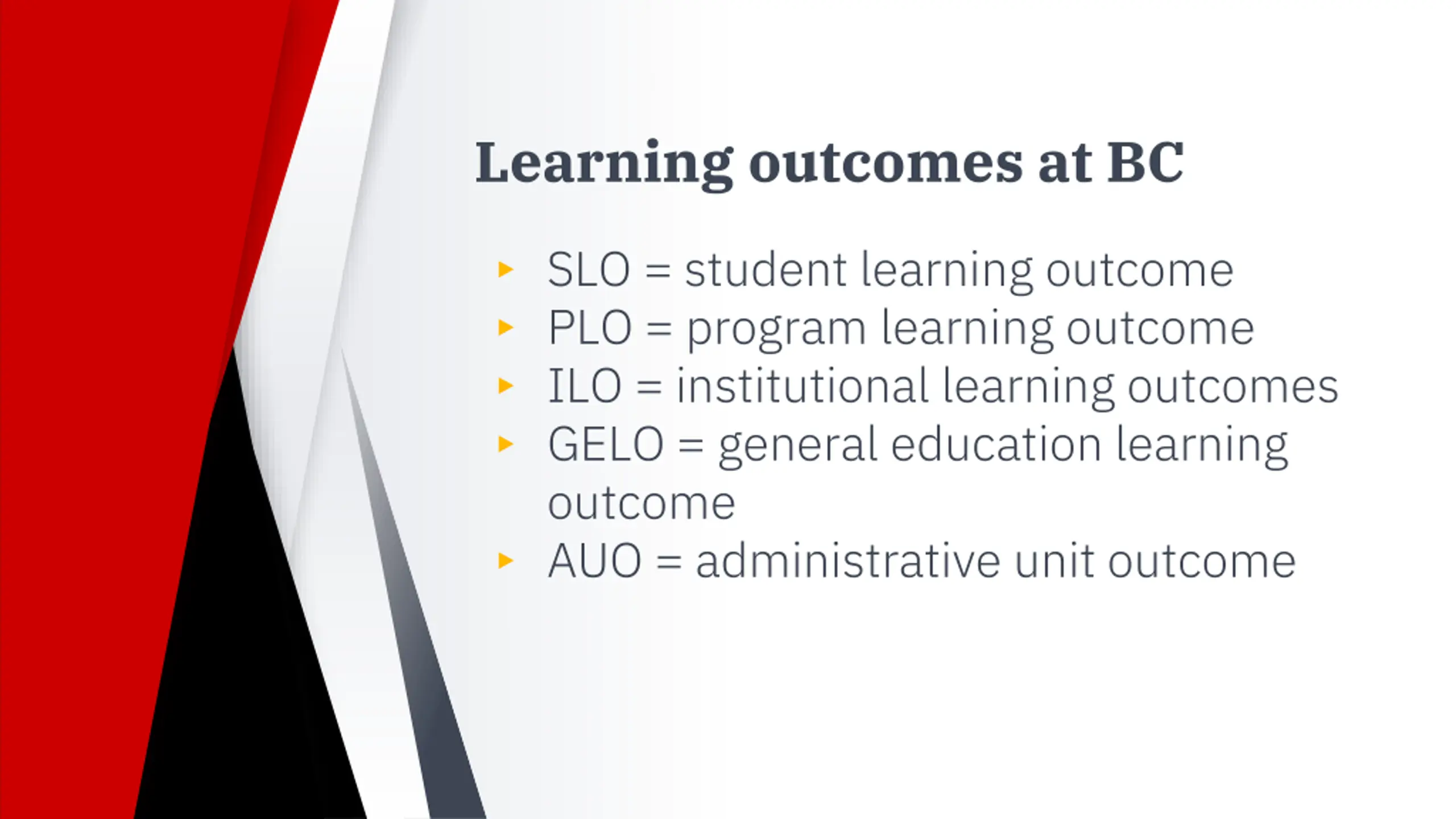 Learning outcomes at BC SLO = student learning outcome PLO = program learning outcome ILO = institutional learning outcomes GELO = general education learning outcome AUO = administrative unit outcome