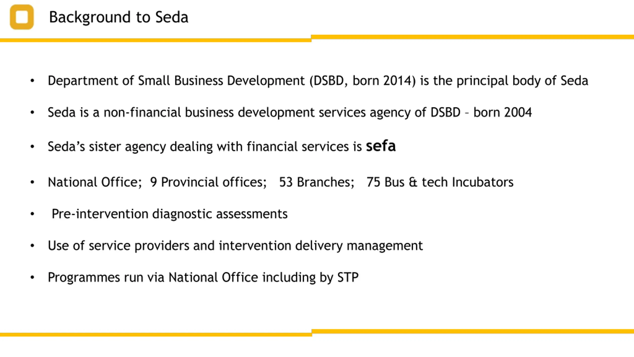 Background to Seda Department of Small Business Development (DSBD, born 2014) is the principal body of Seda Seda is a non-financial business development services agency of DSBD born 2004 Seda s sister agency dealing with financial services is sefa National Office; 9 Provincial offices; 53 Branches; 75 Bus & tech Incubators Pre-intervention diagnostic assessments Use of service providers and intervention delivery management Programmes run via National Office including by STP
