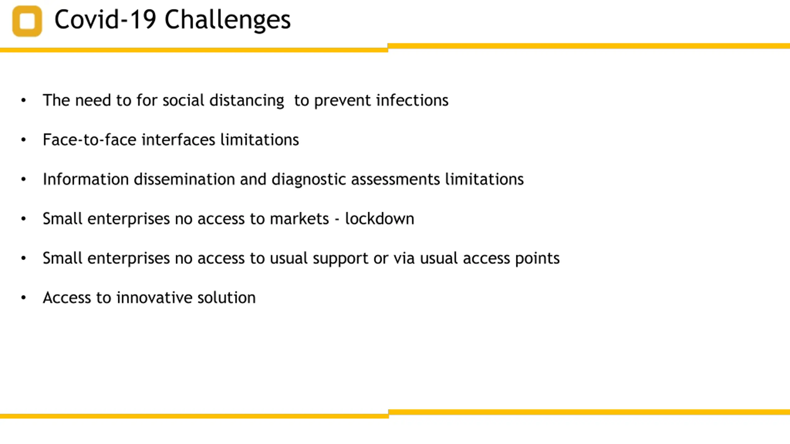 Covid-19 Challenges The need to for social distancing to prevent infections Face-to-face interfaces limitations Information dissemination and diagnostic assessments limitations Small enterprises no access to markets - lockdown Small enterprises no access to usual support or via usual access points Access to innovative solution