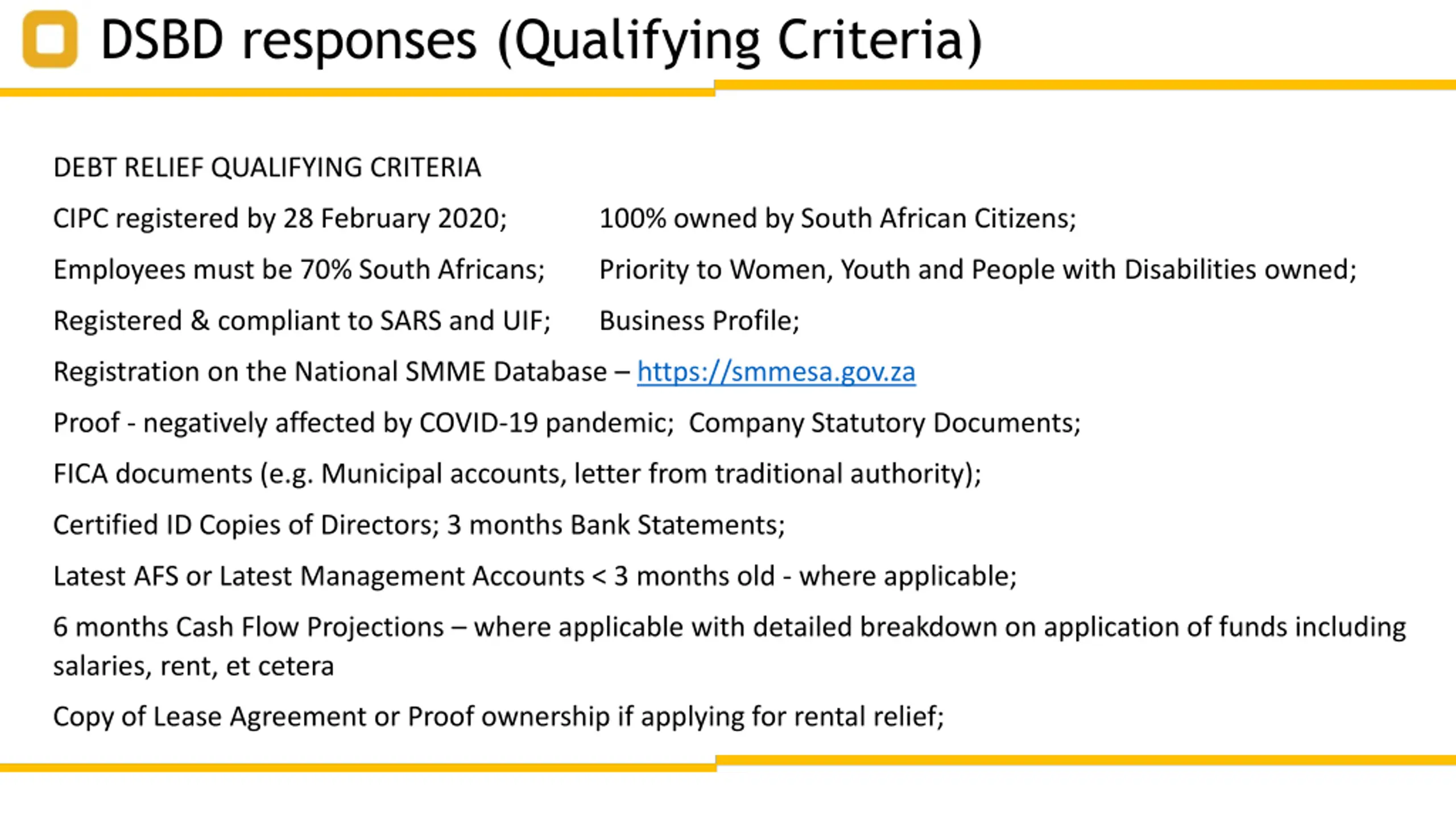 DSBD responses (Qualifying Criteria) DEBT RELIEF QUALIFYING CRITERIA CIPC registered by 28 February 2020; 100% owned by South African Citizens; Employees must be 70% South Africans; Priority to Women, Youth and People with Disabilities owned; Registered & compliant to SARS and UIF; Business Profile; Registration on the National SMME Database https://smmesa.gov.za Proof - negatively affected by COVID-19 pandemic; Company Statutory Documents; FICA documents (e.g. Municipal accounts, letter from traditional authority); Certified ID Copies of Directors; 3 months Bank Statements; Latest AFS or Latest Management Accounts < 3 months old - where applicable; 6 months Cash Flow Projections where applicable with detailed breakdown on application of funds including salaries, rent, et cetera Copy of Lease Agreement or Proof ownership if applying for rental relief;