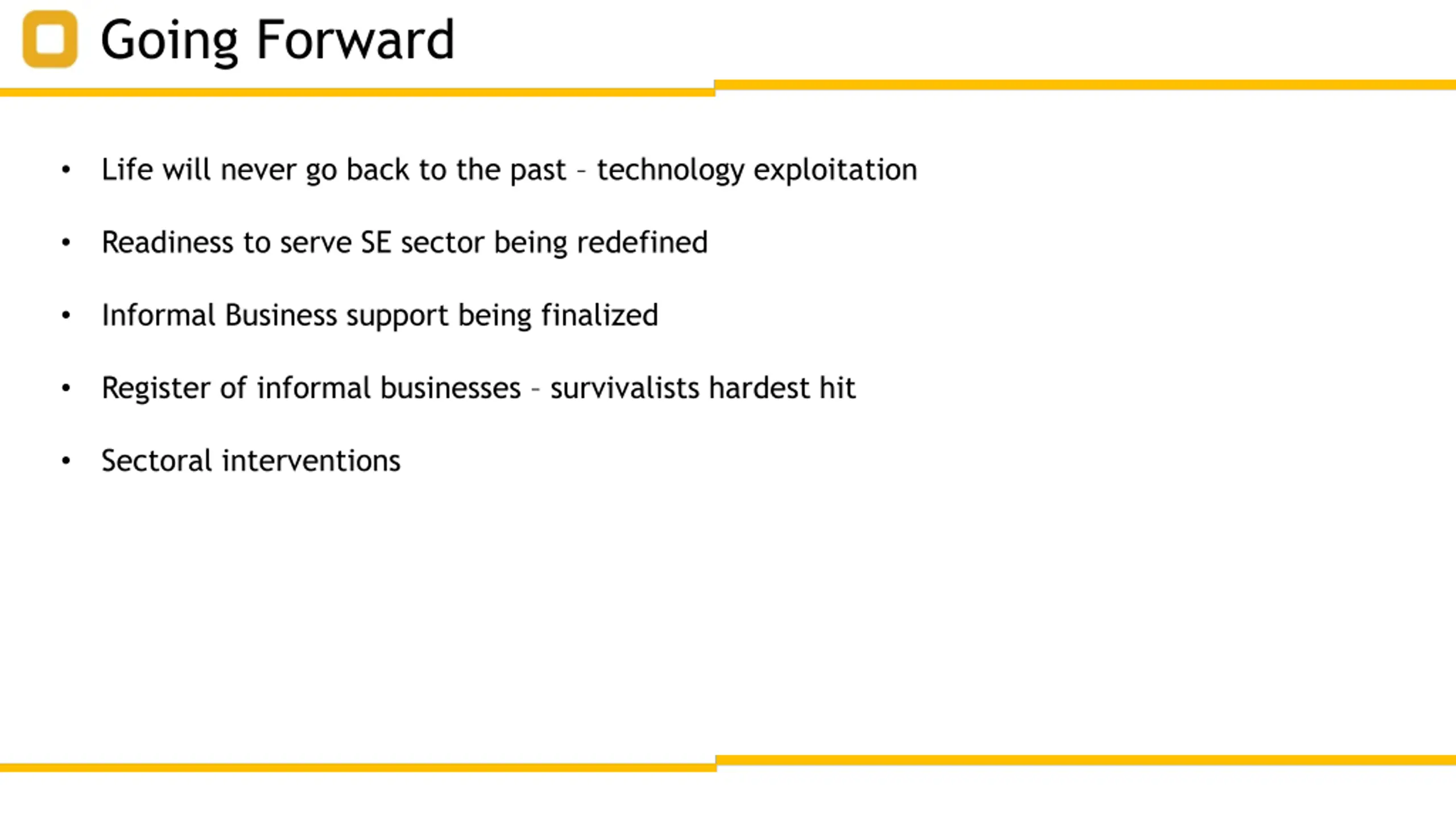 Going Forward Life will never go back to the past technology exploitation Readiness to serve SE sector being redefined Informal Business support being finalized Register of informal businesses survivalists hardest hit Sectoral interventions