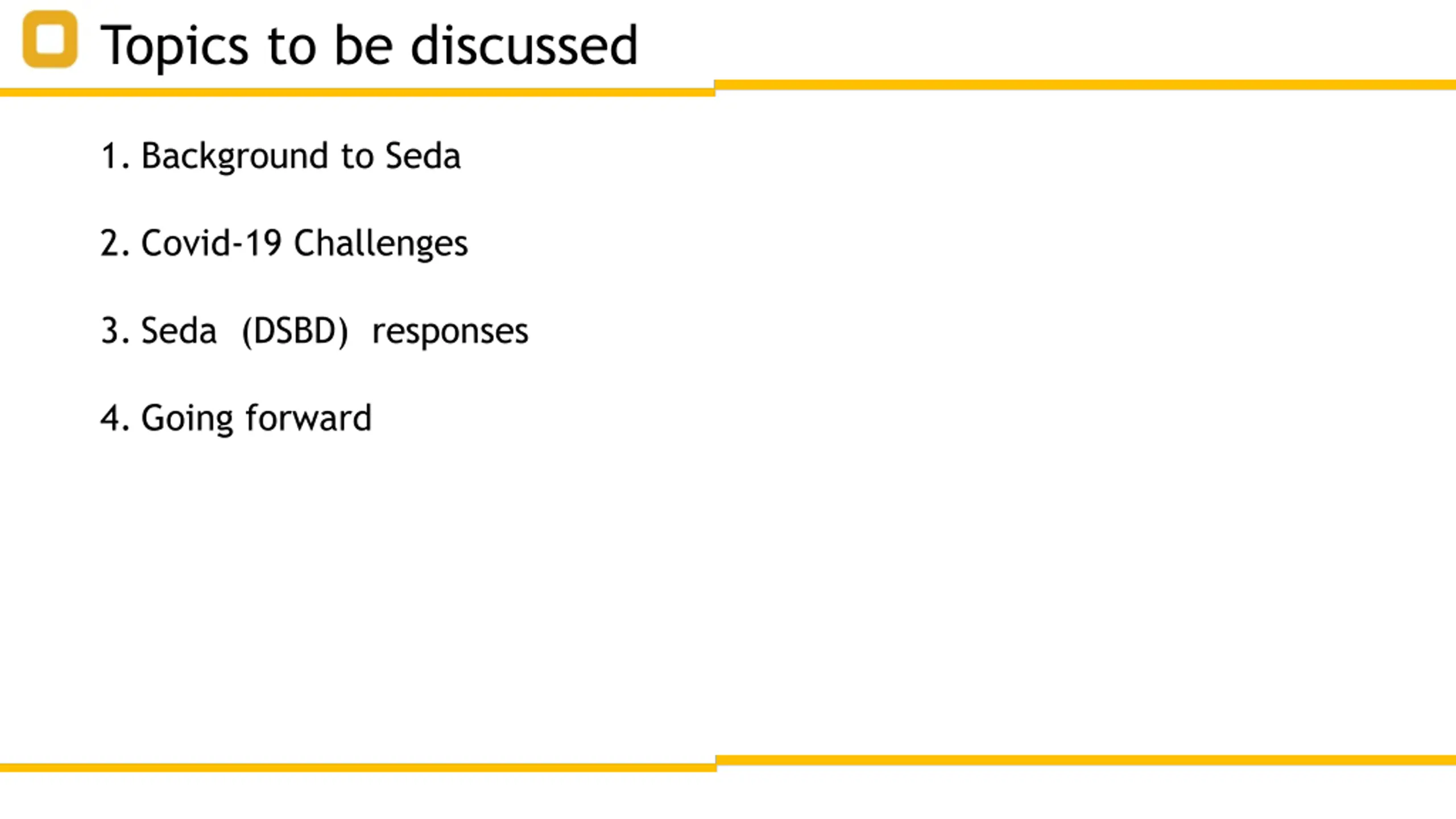 Topics to be discussed 1. Background to Seda 2. Covid-19 Challenges 3. Seda (DSBD) responses 4. Going forward