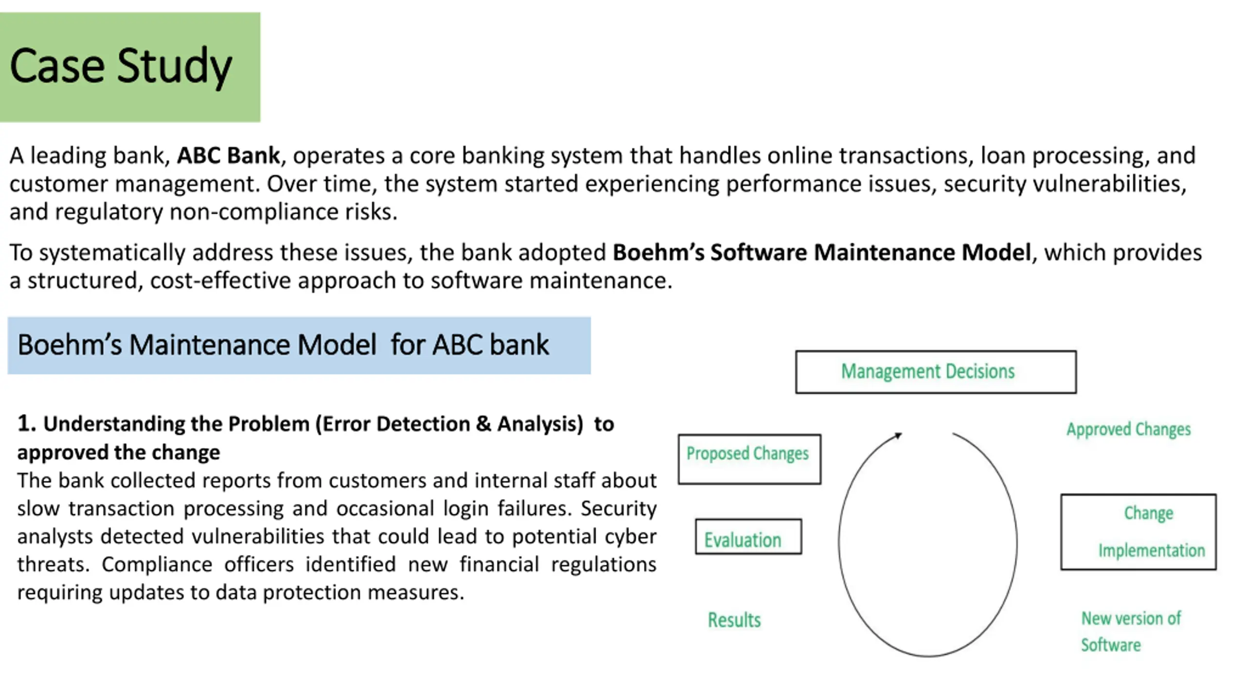 Case Study Case Study A leading bank, ABC Bank, operates a core banking system that handles online transactions, loan processing, and customer management. Over time, the system started experiencing performance issues, security vulnerabilities, and regulatory non-compliance risks. To systematically address these issues, the bank adopted Boehm s Software Maintenance Model, which provides a structured, cost-effective approach to software maintenance. Boehm s Maintenance Model for ABC bank Boehm s Maintenance Model for ABC bank 1. Understanding the Problem (Error Detection & Analysis) to approved the change The bank collected reports from customers and internal staff about slow transaction processing and occasional login failures. Security analysts detected vulnerabilities that could lead to potential cyber threats. Compliance officers identified new financial regulations requiring updates to data protection measures.