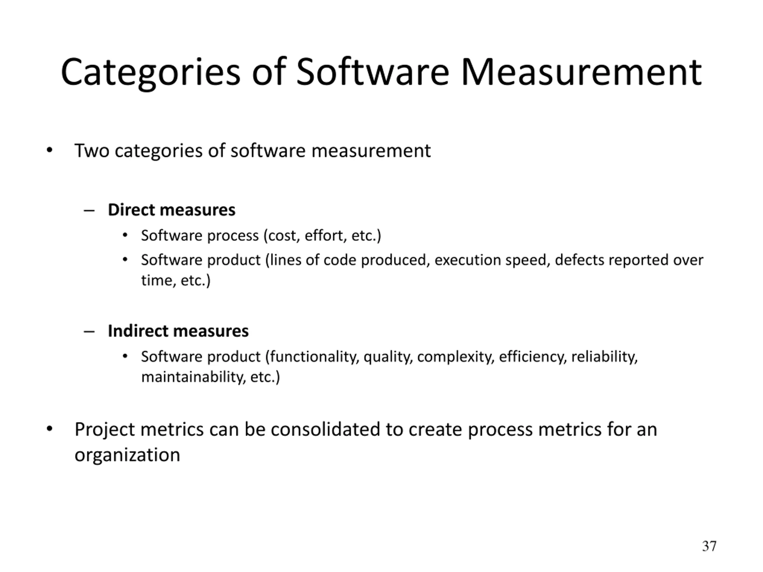 Categories of Software Measurement Two categories of software measurement Direct measures Software process (cost, effort, etc.) Software product (lines of code produced, execution speed, defects reported over time, etc.) Indirect measures Software product (functionality, quality, complexity, efficiency, reliability, maintainability, etc.) Project metrics can be consolidated to create process metrics for an organization 37