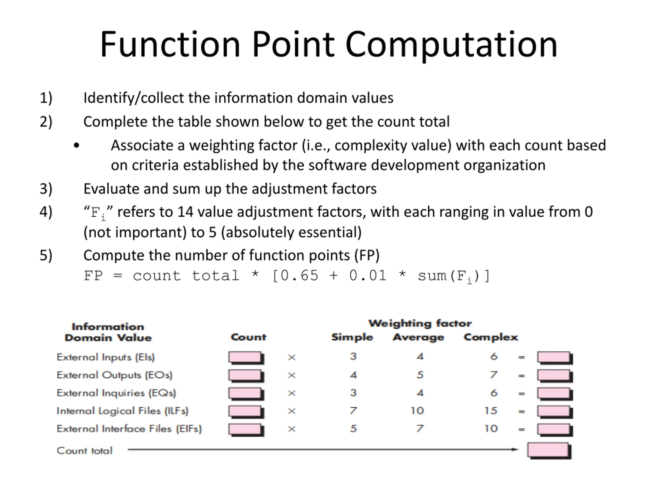 Function Point Computation 1) 2) Identify/collect the information domain values Complete the table shown below to get the count total Associate a weighting factor (i.e., complexity value) with each count based on criteria established by the software development organization Evaluate and sum up the adjustment factors Fi refers to 14 value adjustment factors, with each ranging in value from 0 (not important) to 5 (absolutely essential) Compute the number of function points (FP) FP = count total * [0.65 + 0.01 * sum(Fi)] 3) 4) 5)