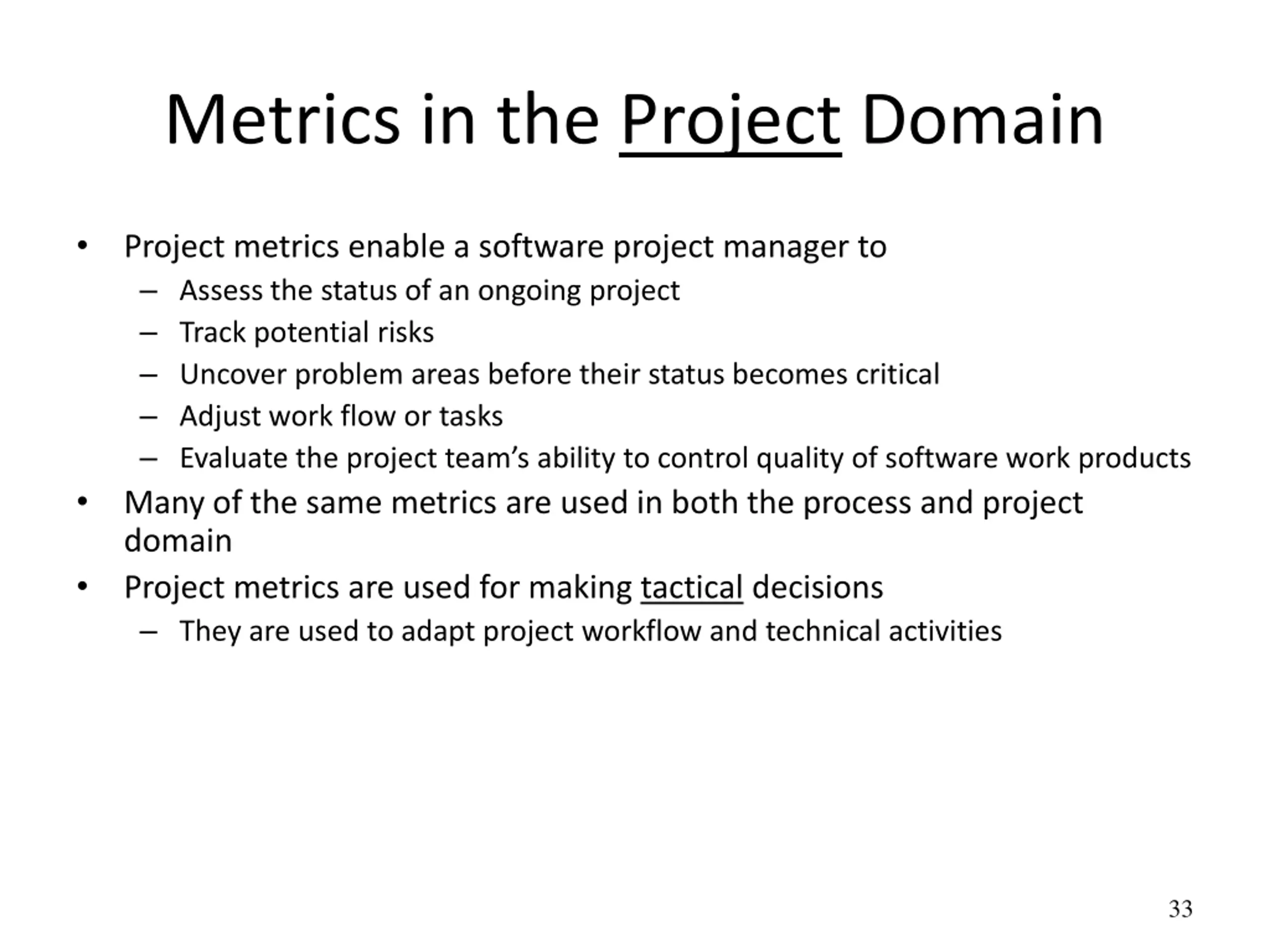 Metrics in the Project Domain Project metrics enable a software project manager to Assess the status of an ongoing project Track potential risks Uncover problem areas before their status becomes critical Adjust work flow or tasks Evaluate the project team s ability to control quality of software work products Many of the same metrics are used in both the process and project domain Project metrics are used for making tactical decisions They are used to adapt project workflow and technical activities 33