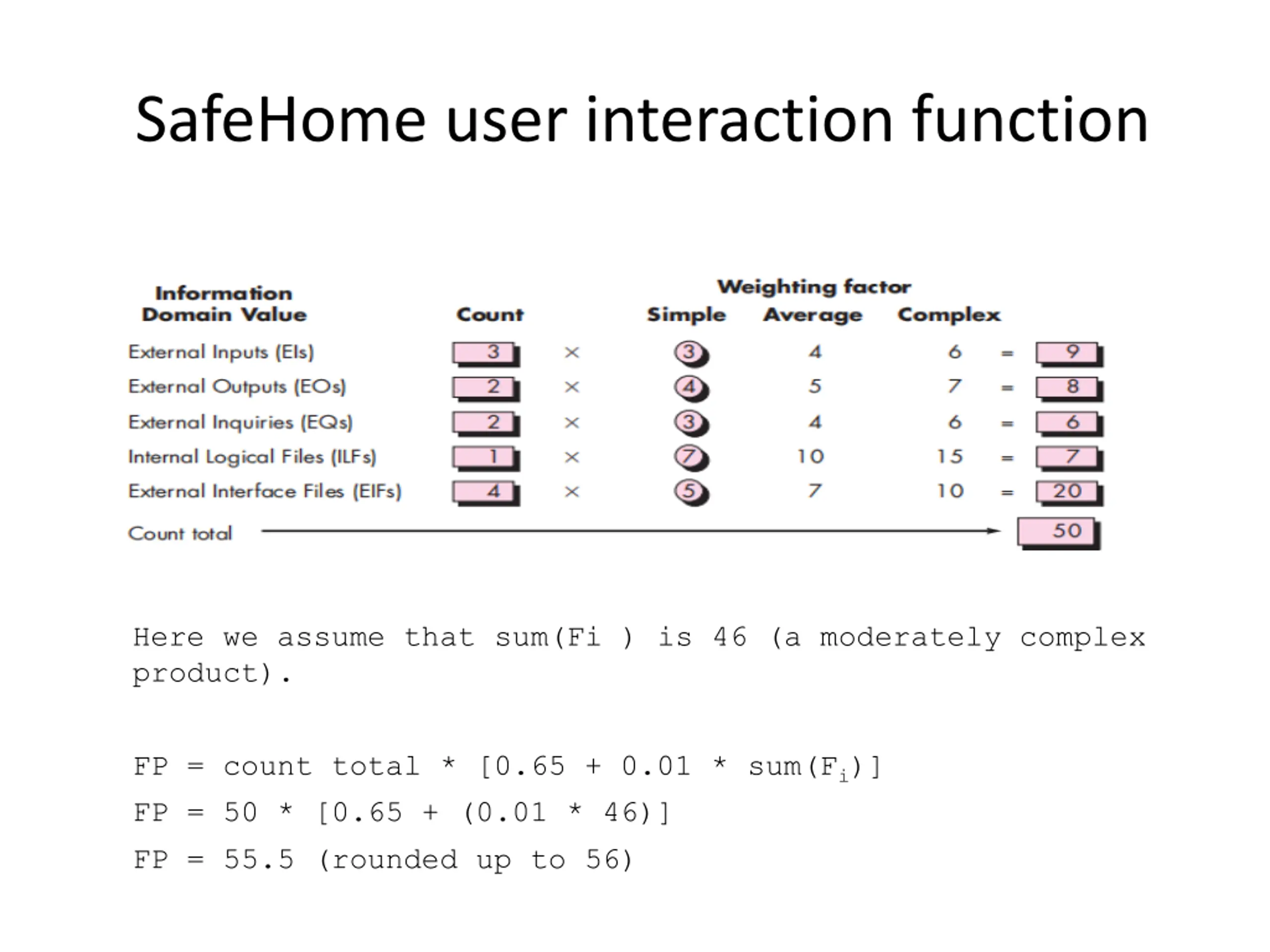 SafeHome user interaction function Here we assume that sum(Fi ) is 46 (a moderately complex product). FP = count total * [0.65 + 0.01 * sum(Fi)] FP = 50 * [0.65 + (0.01 * 46)] FP = 55.5 (rounded up to 56)