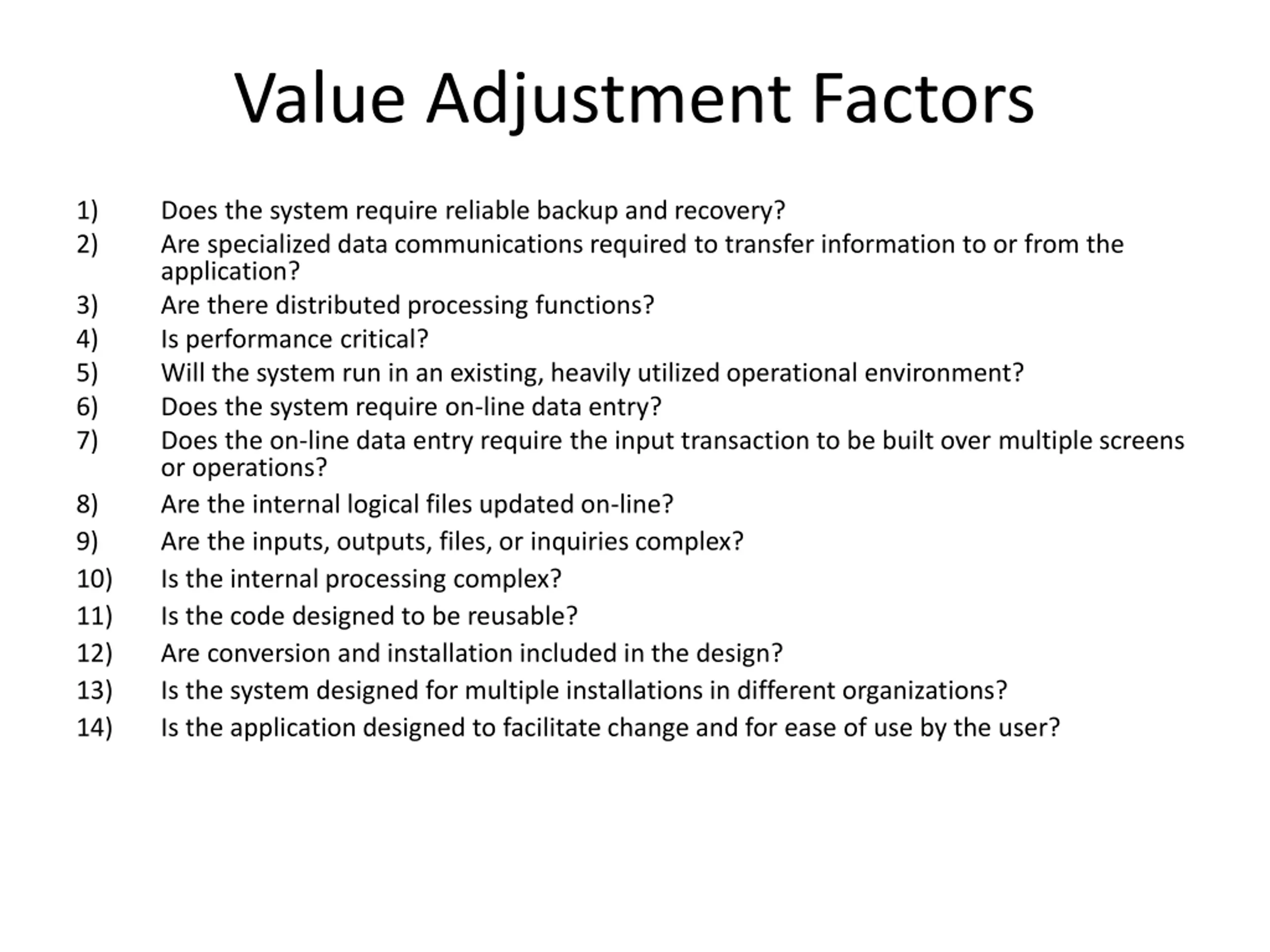 Value Adjustment Factors 1) 2) Does the system require reliable backup and recovery? Are specialized data communications required to transfer information to or from the application? Are there distributed processing functions? Is performance critical? Will the system run in an existing, heavily utilized operational environment? Does the system require on-line data entry? Does the on-line data entry require the input transaction to be built over multiple screens or operations? Are the internal logical files updated on-line? Are the inputs, outputs, files, or inquiries complex? Is the internal processing complex? Is the code designed to be reusable? Are conversion and installation included in the design? Is the system designed for multiple installations in different organizations? Is the application designed to facilitate change and for ease of use by the user? 3) 4) 5) 6) 7) 8) 9) 10) 11) 12) 13) 14)