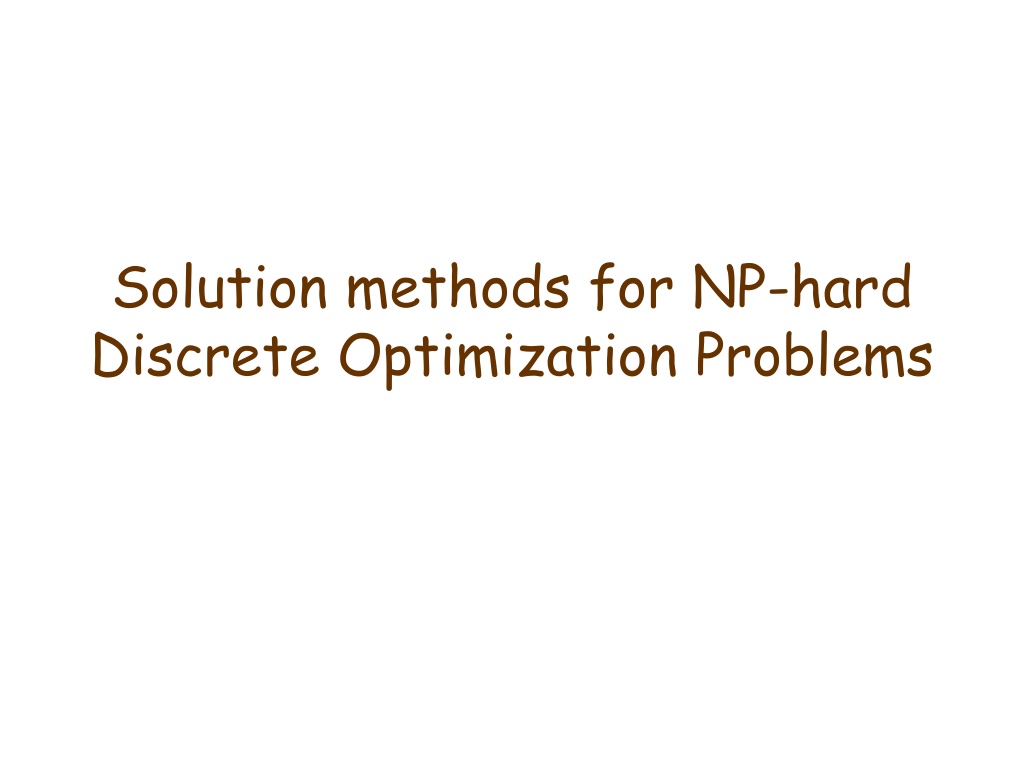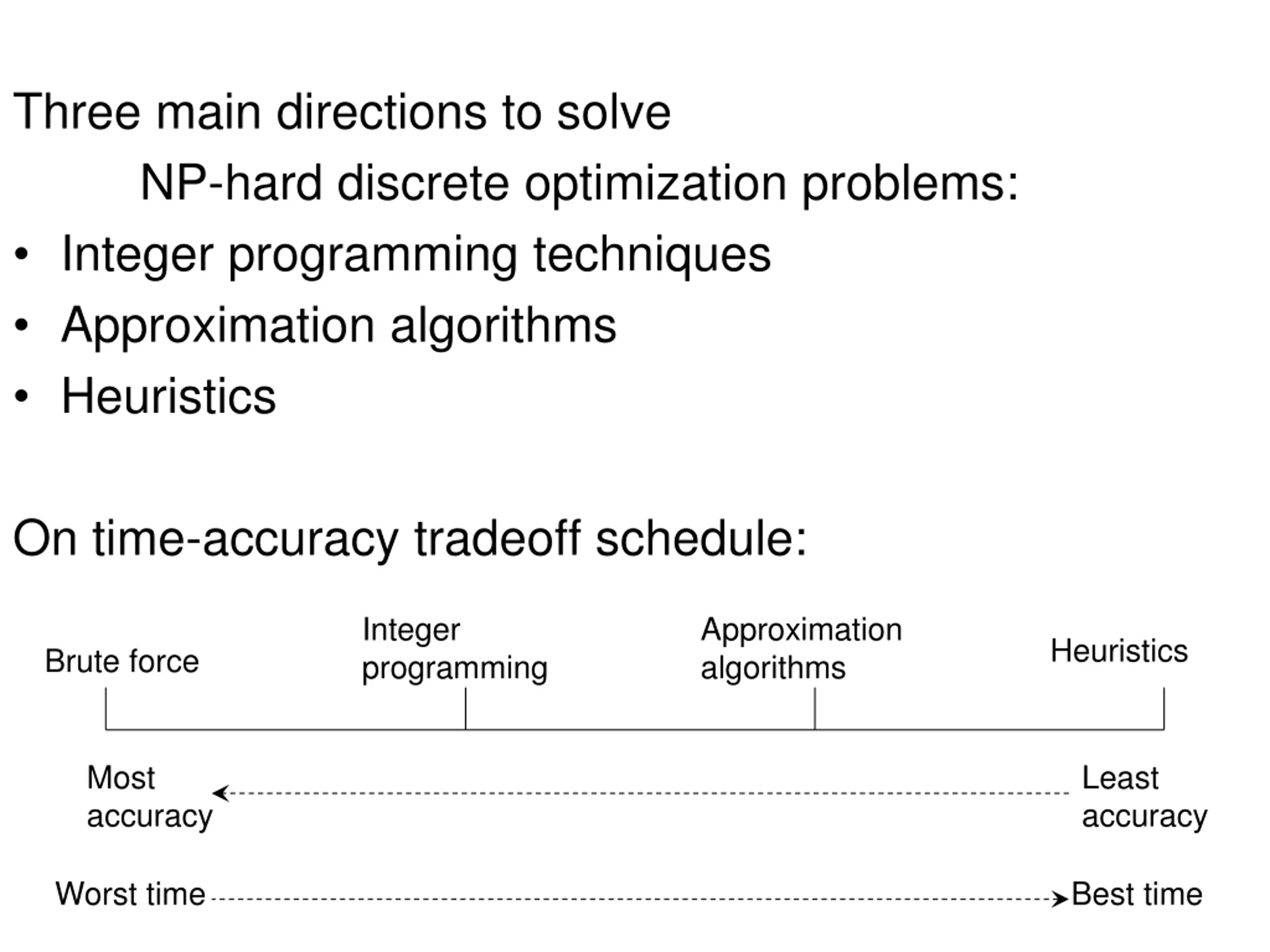 Three main directions to solve NP-hard discrete optimization problems: Integer programming techniques Approximation algorithms Heuristics On time-accuracy tradeoff schedule: Integer programming Approximation algorithms Heuristics Brute force Most accuracy Least accuracy Worst time Best time