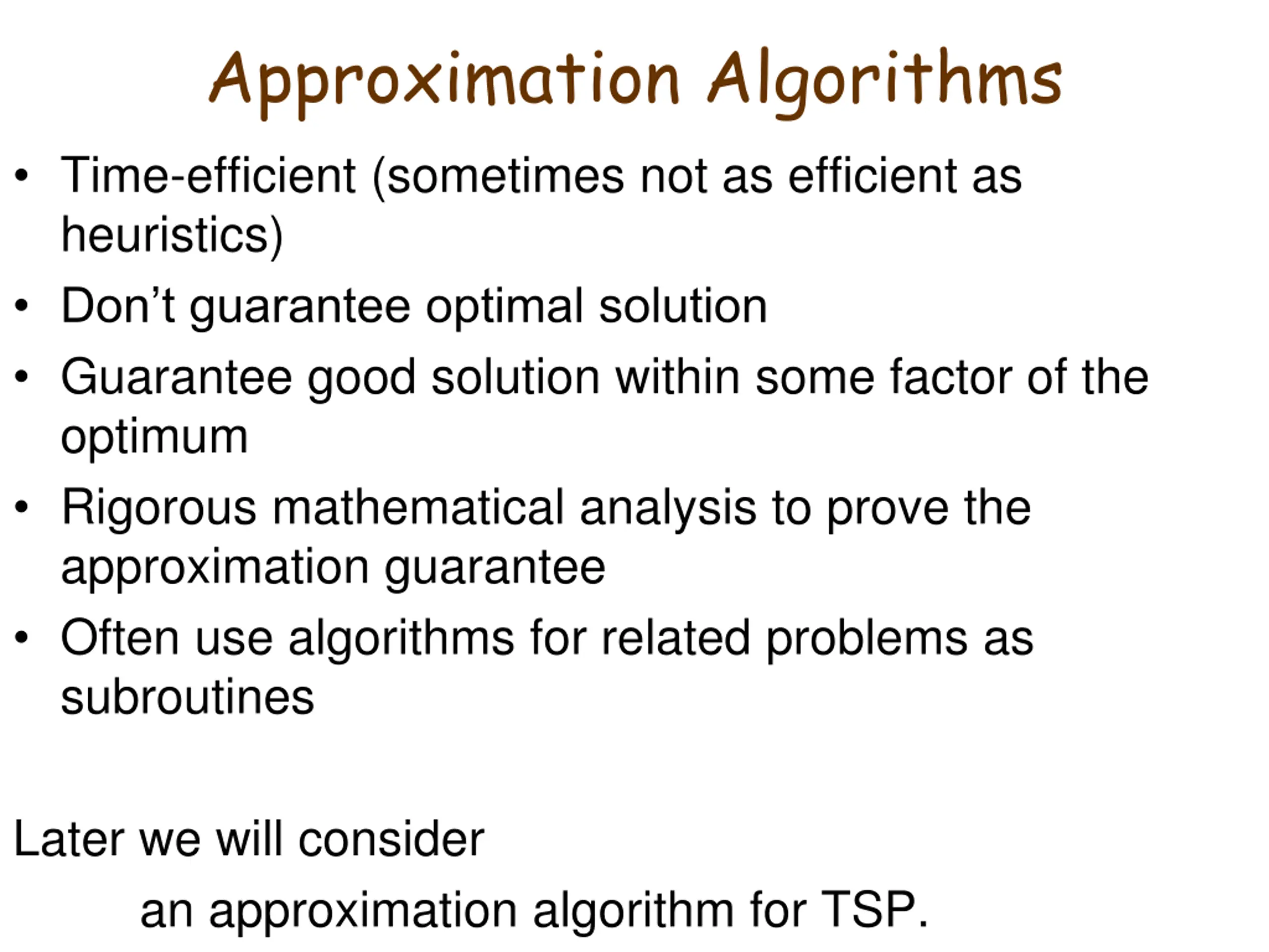 Approximation Algorithms Time-efficient (sometimes not as efficient as heuristics) Don t guarantee optimal solution Guarantee good solution within some factor of the optimum Rigorous mathematical analysis to prove the approximation guarantee Often use algorithms for related problems as subroutines Later we will consider an approximation algorithm for TSP.