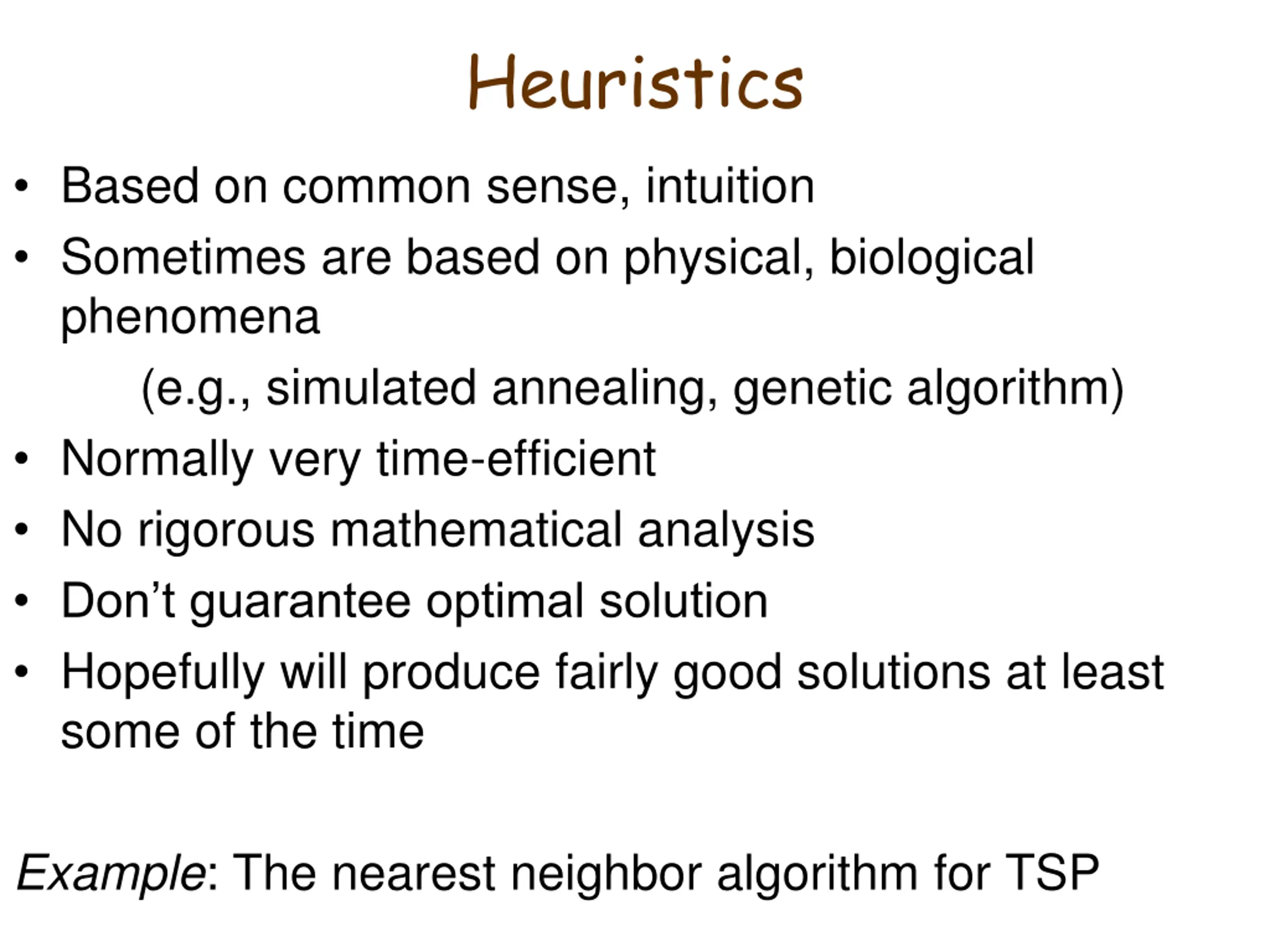 Heuristics Based on common sense, intuition Sometimes are based on physical, biological phenomena (e.g., simulated annealing, genetic algorithm) Normally very time-efficient No rigorous mathematical analysis Don t guarantee optimal solution Hopefully will produce fairly good solutions at least some of the time Example: The nearest neighbor algorithm for TSP