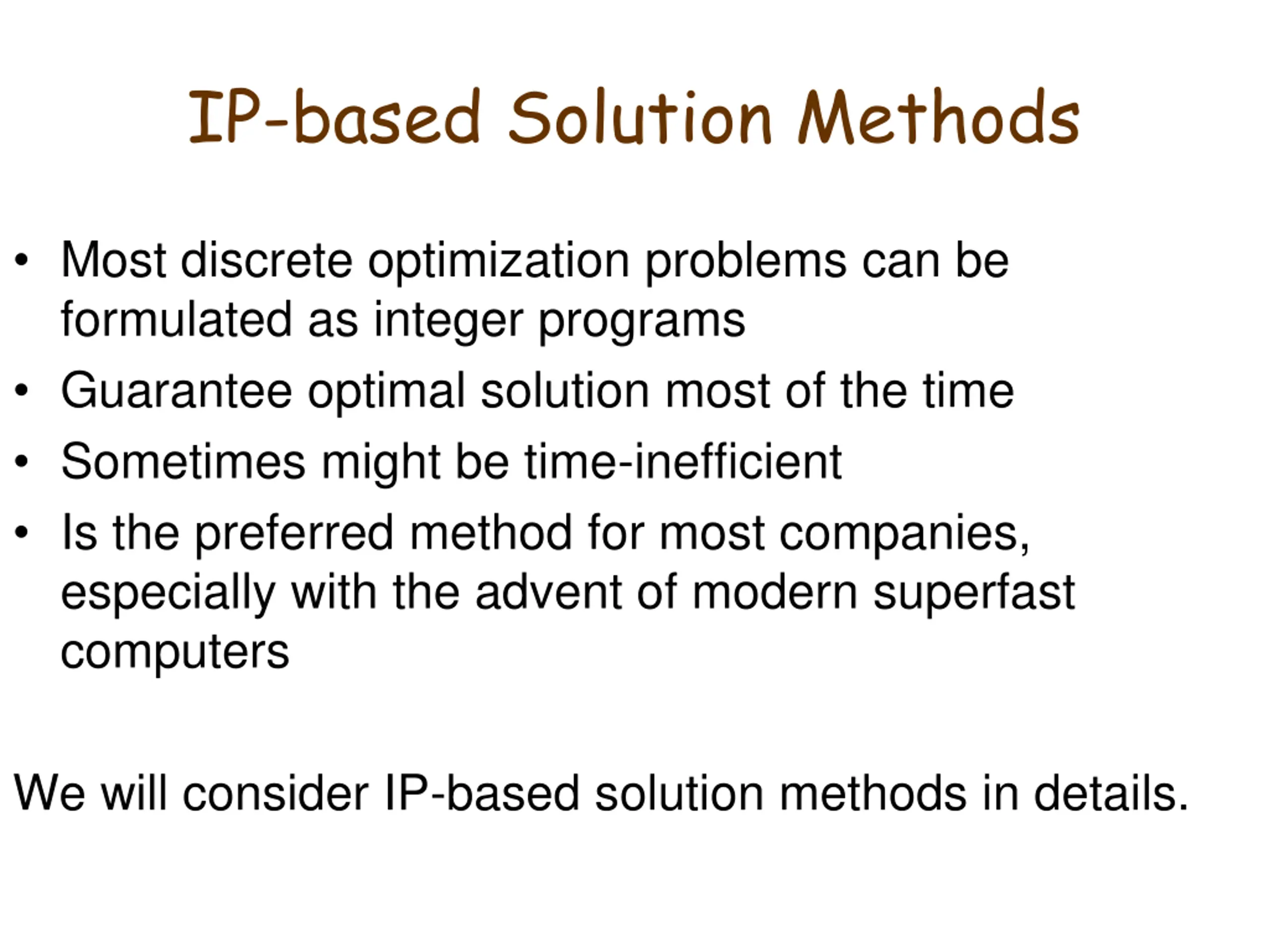 IP-based Solution Methods Most discrete optimization problems can be formulated as integer programs Guarantee optimal solution most of the time Sometimes might be time-inefficient Is the preferred method for most companies, especially with the advent of modern superfast computers We will consider IP-based solution methods in details.