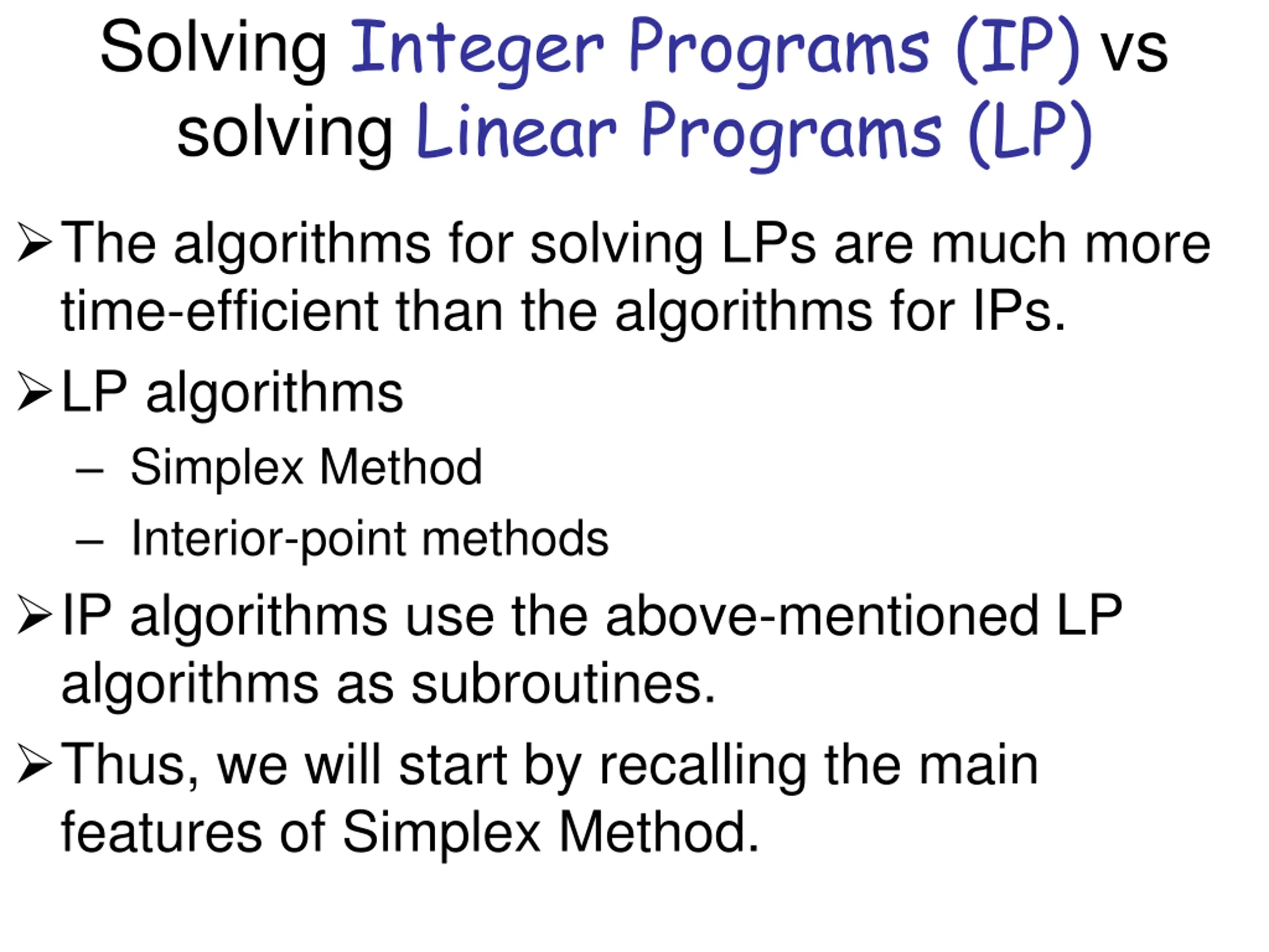 Solving Integer Programs (IP) vs solving Linear Programs (LP) The algorithms for solving LPs are much more time-efficient than the algorithms for IPs. LP algorithms Simplex Method Interior-point methods IP algorithms use the above-mentioned LP algorithms as subroutines. Thus, we will start by recalling the main features of Simplex Method.