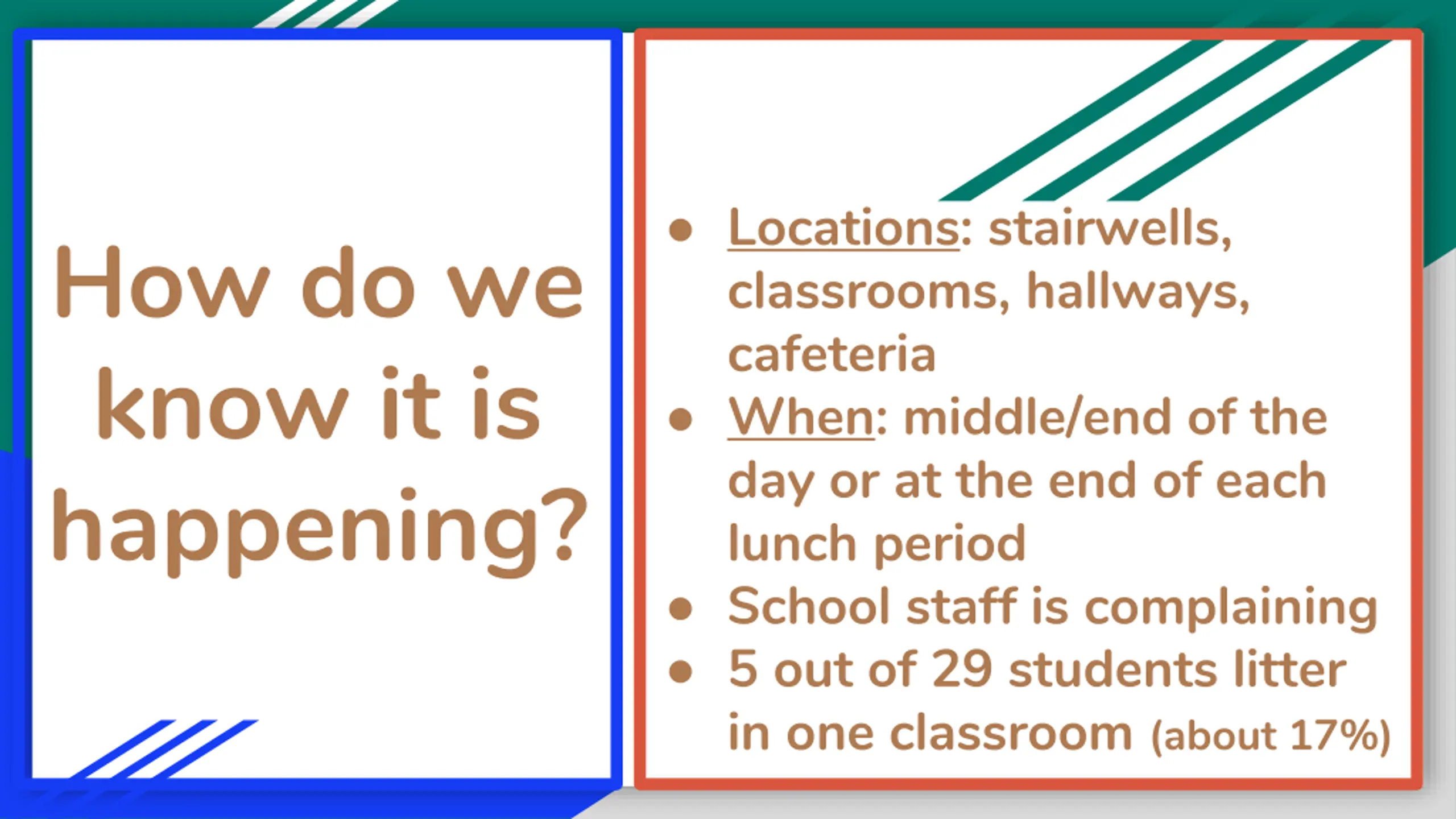 Locations: stairwells, classrooms, hallways, cafeteria When: middle/end of the day or at the end of each lunch period School staff is complaining 5 out of 29 students litter in one classroom (about 17%) How do we know it is happening?