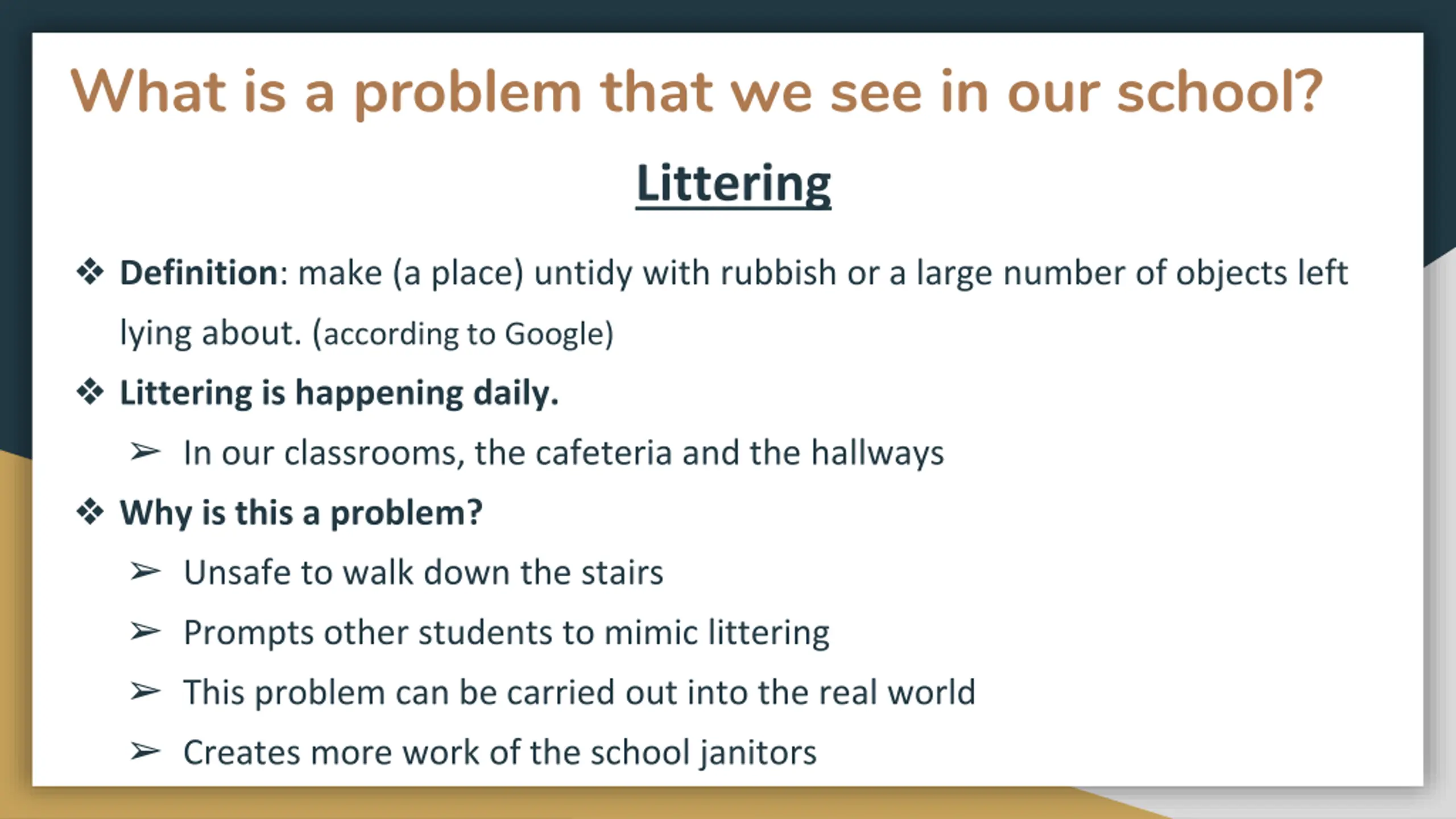 What is a problem that we see in our school? Littering Definition: make (a place) untidy with rubbish or a large number of objects left lying about. (according to Google) Littering is happening daily. In our classrooms, the cafeteria and the hallways Why is this a problem? Unsafe to walk down the stairs Prompts other students to mimic littering This problem can be carried out into the real world Creates more work of the school janitors