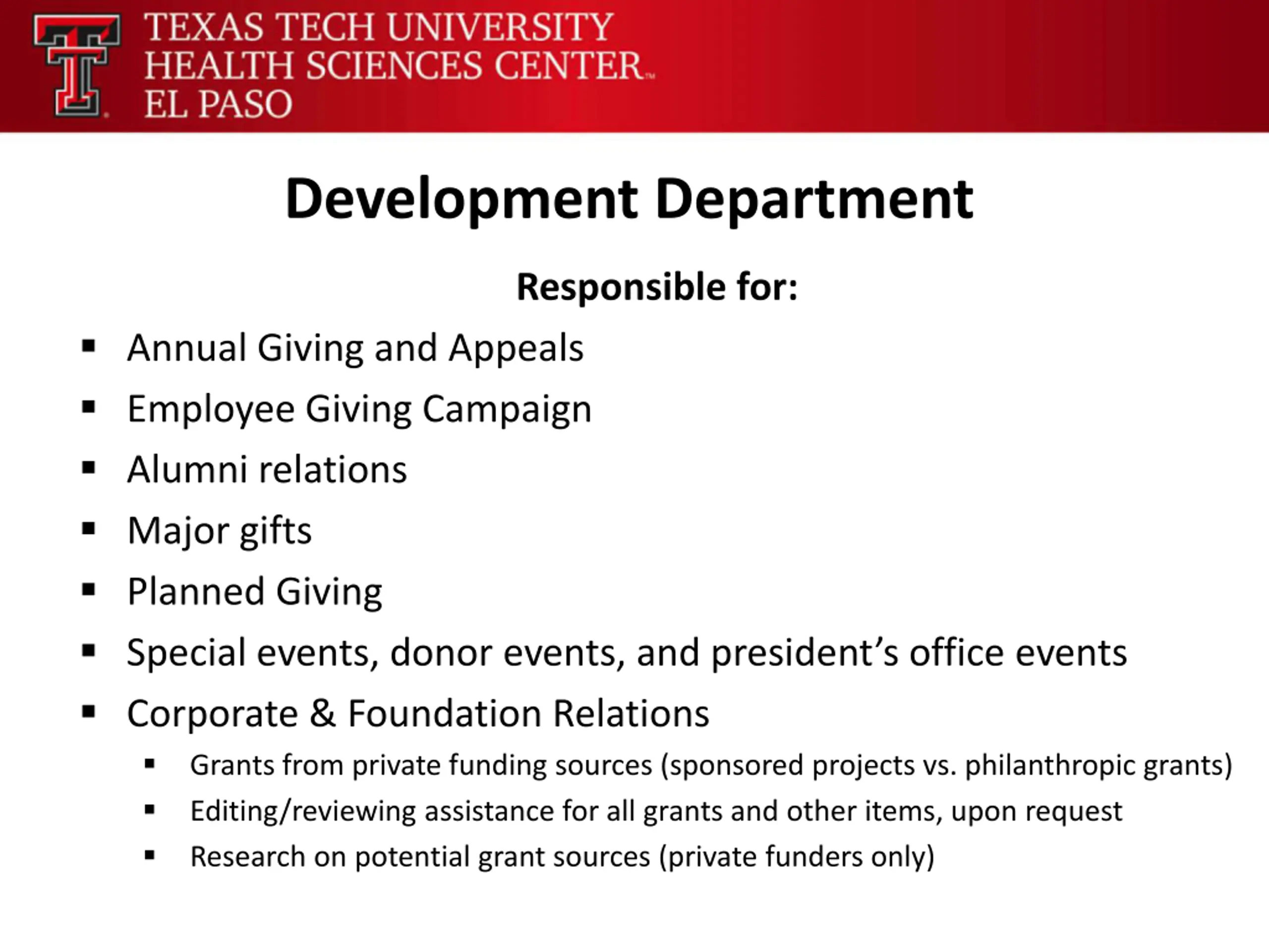 Development Department Responsible for: Annual Giving and Appeals Employee Giving Campaign Alumni relations Major gifts Planned Giving Special events, donor events, and president s office events Corporate & Foundation Relations Grants from private funding sources (sponsored projects vs. philanthropic grants) Editing/reviewing assistance for all grants and other items, upon request Research on potential grant sources (private funders only)