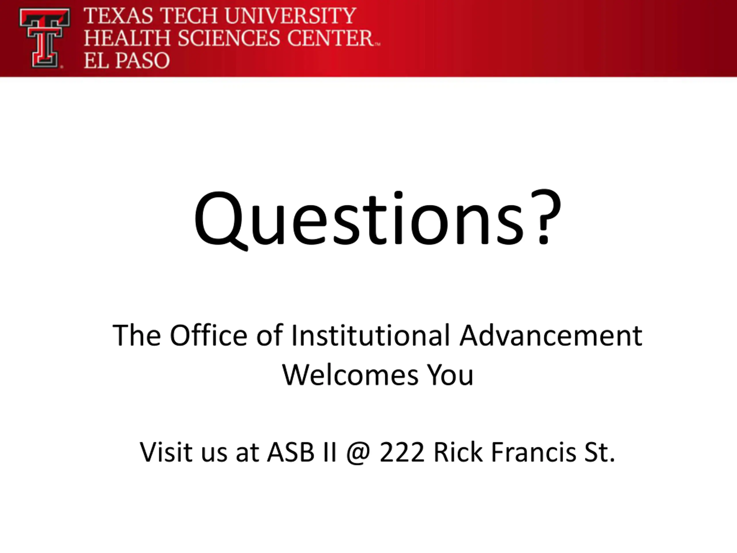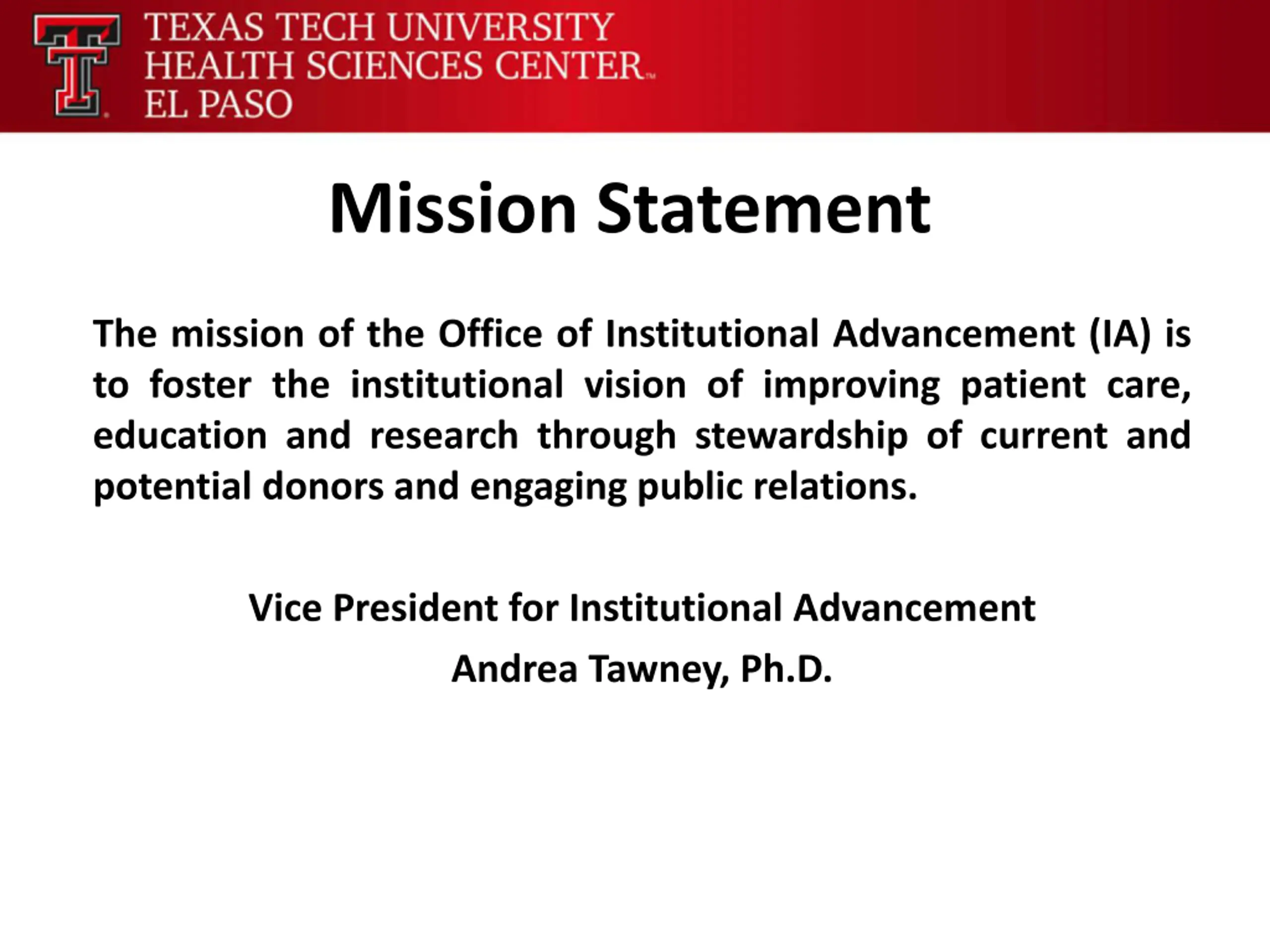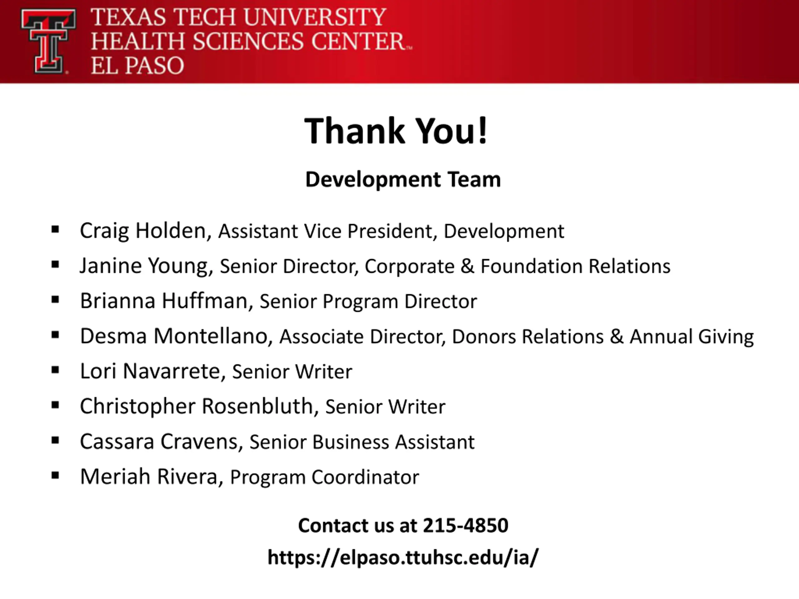 Thank You! Development Team Craig Holden, Assistant Vice President, Development Janine Young, Senior Director, Corporate & Foundation Relations Brianna Huffman, Senior Program Director Desma Montellano, Associate Director, Donors Relations & Annual Giving Lori Navarrete, Senior Writer Christopher Rosenbluth, Senior Writer Cassara Cravens, Senior Business Assistant Meriah Rivera, Program Coordinator Contact us at 215-4850 https://elpaso.ttuhsc.edu/ia/