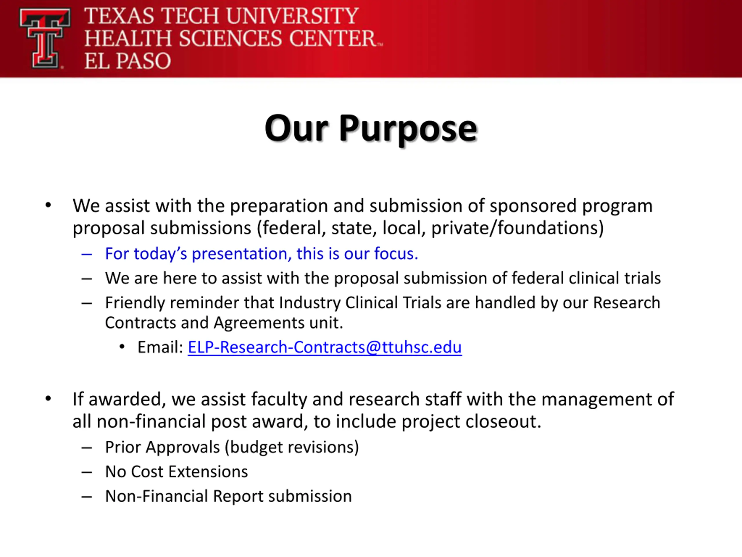 Our Purpose We assist with the preparation and submission of sponsored program proposal submissions (federal, state, local, private/foundations) For today s presentation, this is our focus. We are here to assist with the proposal submission of federal clinical trials Friendly reminder that Industry Clinical Trials are handled by our Research Contracts and Agreements unit. Email: ELP-Research-Contracts@ttuhsc.edu If awarded, we assist faculty and research staff with the management of all non-financial post award, to include project closeout. Prior Approvals (budget revisions) No Cost Extensions Non-Financial Report submission