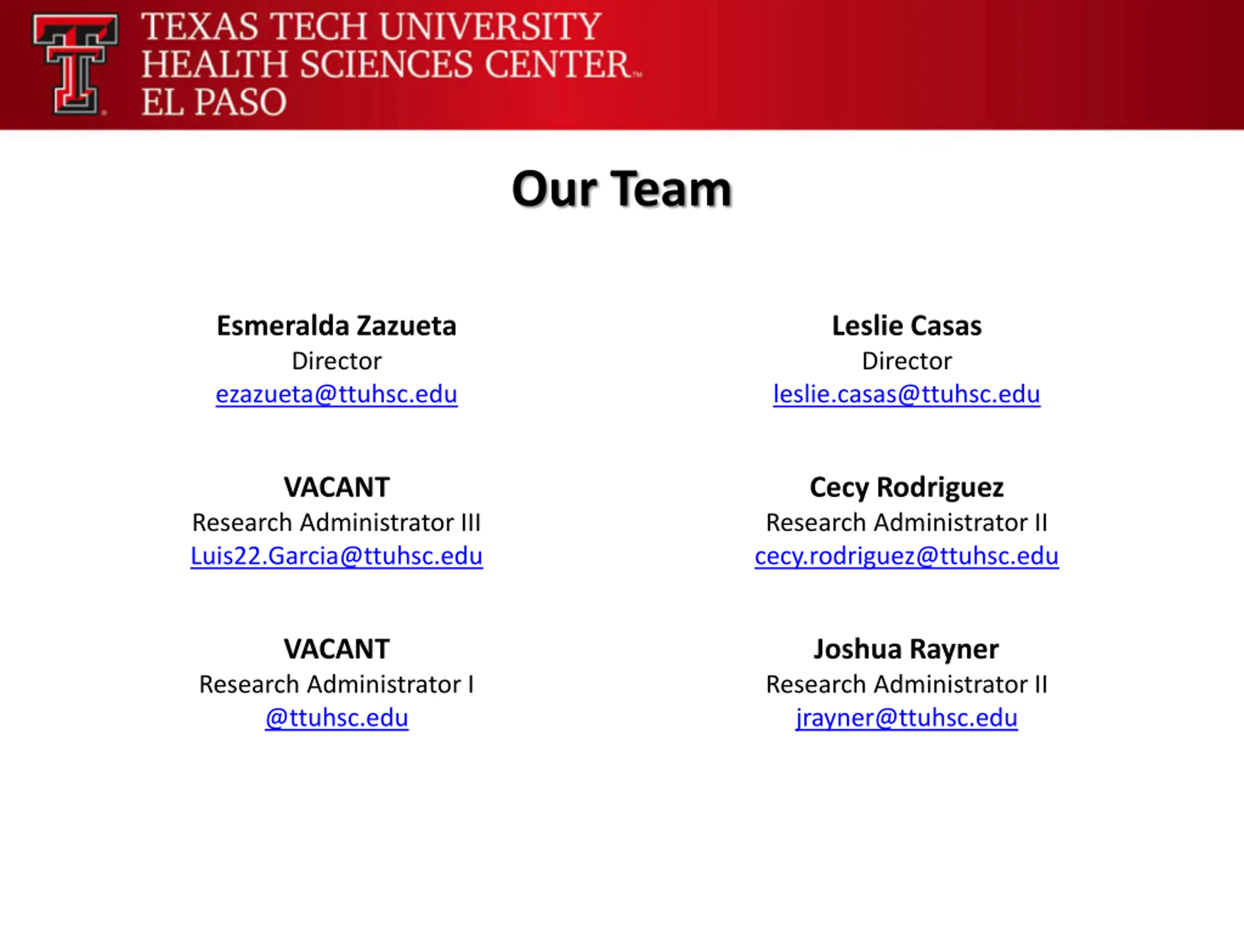 Our Team Esmeralda Zazueta Director ezazueta@ttuhsc.edu Leslie Casas Director leslie.casas@ttuhsc.edu VACANT Cecy Rodriguez Research Administrator II cecy.rodriguez@ttuhsc.edu Research Administrator III Luis22.Garcia@ttuhsc.edu VACANT Joshua Rayner Research Administrator II jrayner@ttuhsc.edu Research Administrator I @ttuhsc.edu