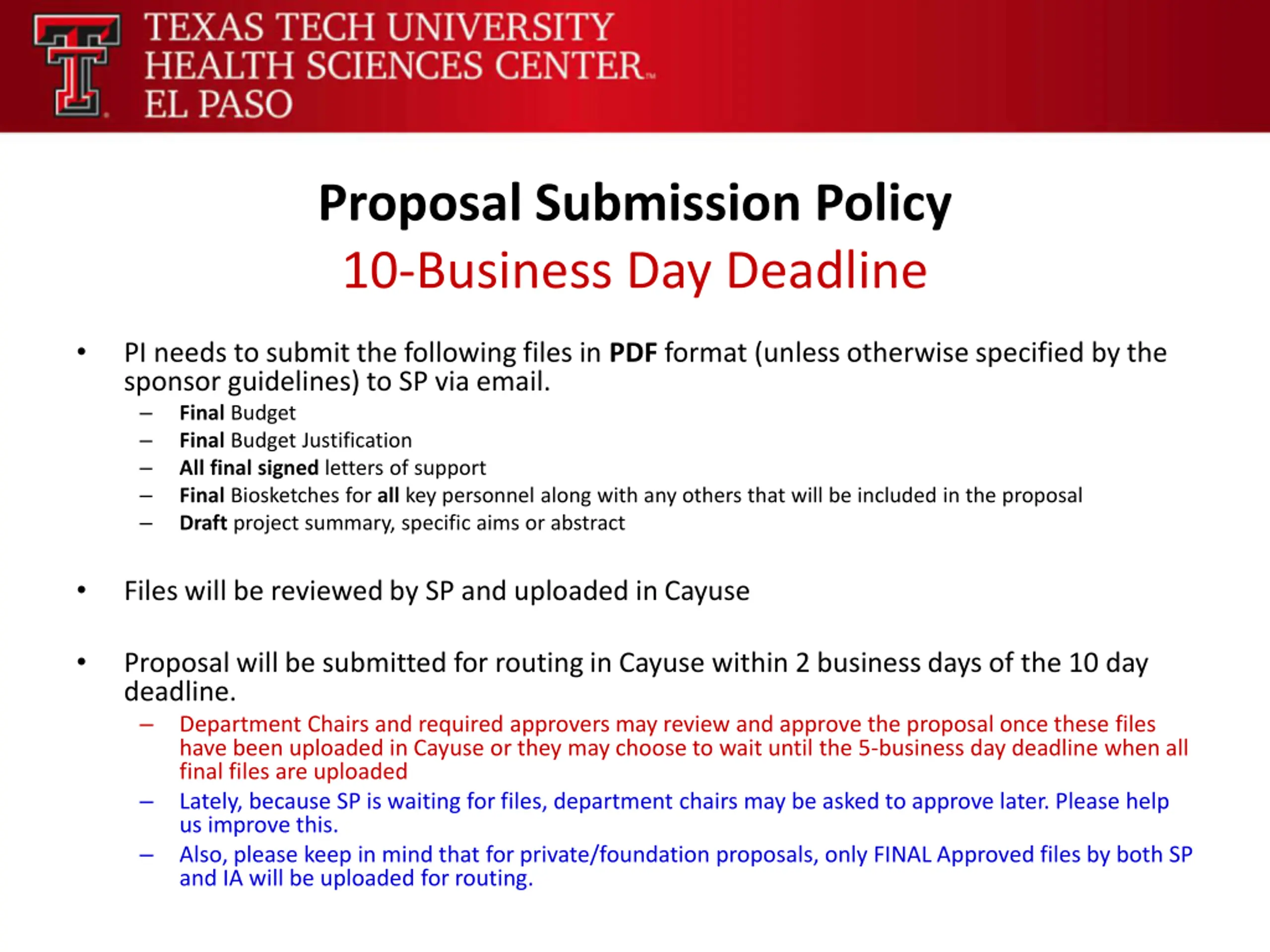 Proposal Submission Policy 10-Business Day Deadline PI needs to submit the following files in PDF format (unless otherwise specified by the sponsor guidelines) to SP via email. Final Budget Final Budget Justification Allfinal signed letters of support Final Biosketches for all key personnel along with any others that will be included in the proposal Draft project summary, specific aims or abstract Files will be reviewed by SP and uploaded in Cayuse Proposal will be submitted for routing in Cayuse within 2 business days of the 10 day deadline. Department Chairs and required approvers may review and approve the proposal once these files have been uploaded in Cayuse or they may choose to wait until the 5-business day deadline when all final files are uploaded Lately, because SP is waiting for files, department chairs may be asked to approve later. Please help us improve this. Also, please keep in mind that for private/foundation proposals, only FINAL Approved files by both SP and IA will be uploaded for routing.