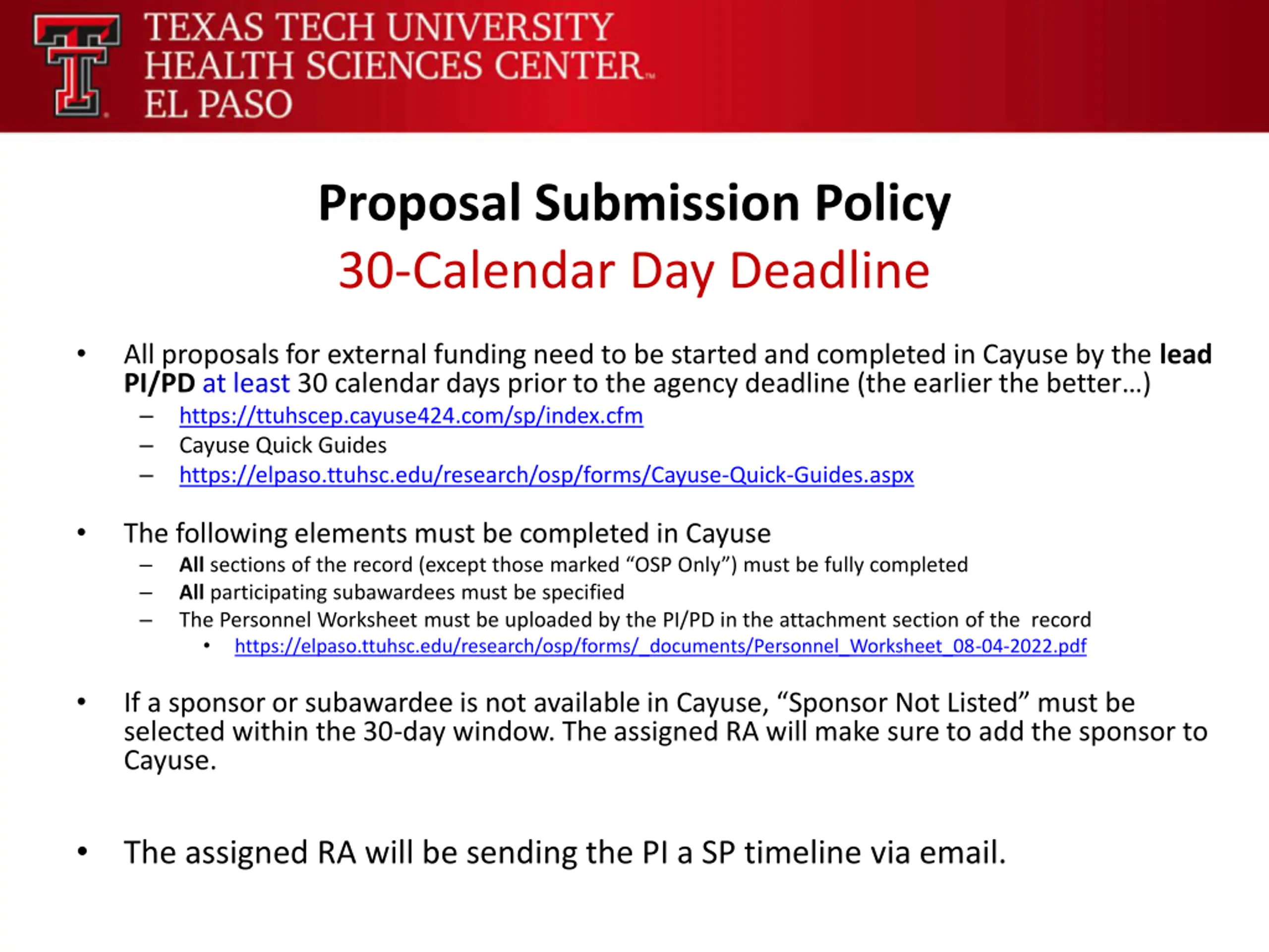Proposal Submission Policy 30-Calendar Day Deadline All proposals for external funding need to be started and completed in Cayuse by the lead PI/PD at least 30 calendar days prior to the agency deadline (the earlier the better ) https://ttuhscep.cayuse424.com/sp/index.cfm Cayuse Quick Guides https://elpaso.ttuhsc.edu/research/osp/forms/Cayuse-Quick-Guides.aspx The following elements must be completed in Cayuse Allsections of the record (except those marked OSP Only ) must be fully completed All participating subawardees must be specified The Personnel Worksheet must be uploaded by the PI/PD in the attachment section of the record https://elpaso.ttuhsc.edu/research/osp/forms/_documents/Personnel_Worksheet_08-04-2022.pdf If a sponsor or subawardee is not available in Cayuse, Sponsor Not Listed must be selected within the 30-day window. The assigned RA will make sure to add the sponsor to Cayuse. The assigned RA will be sending the PI a SP timeline via email.