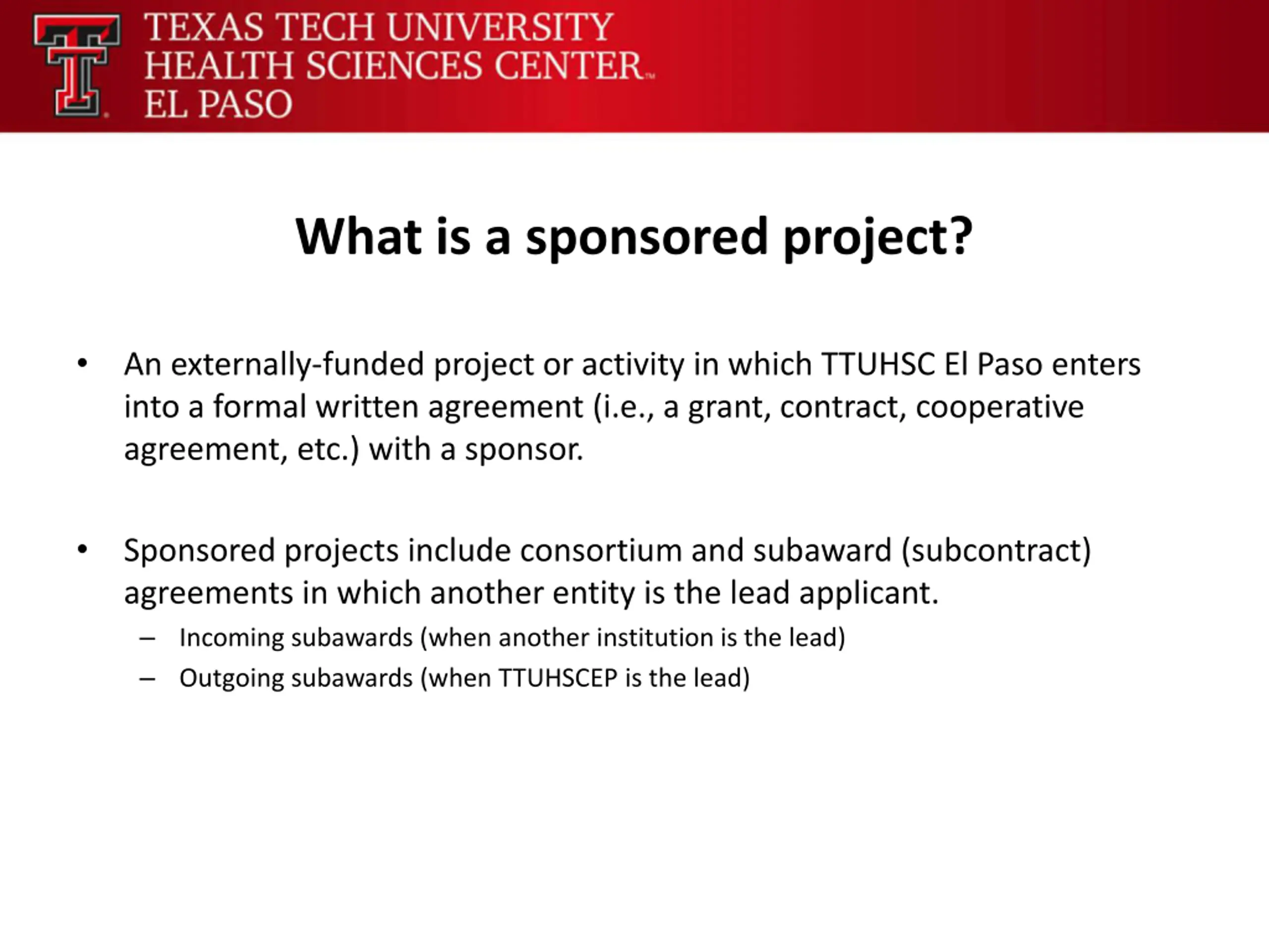 What is a sponsored project? An externally-funded project or activity in which TTUHSC El Paso enters into a formal written agreement (i.e., a grant, contract, cooperative agreement, etc.) with a sponsor. Sponsored projects include consortium and subaward (subcontract) agreements in which another entity is the lead applicant. Incoming subawards (when another institution is the lead) Outgoing subawards (when TTUHSCEP is the lead)